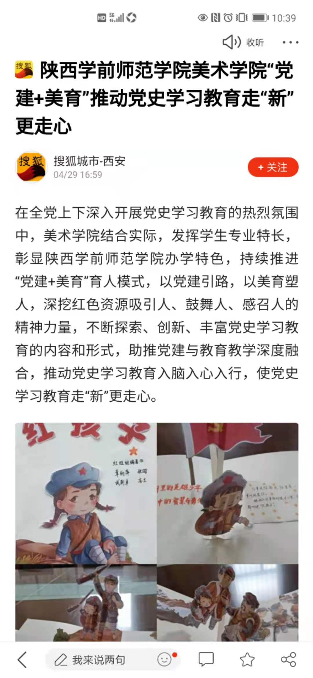 4月29日,搜狐新闻报道了beat365美术学院发挥学生专业特长,彰显学校办学特色,持续推进“党建+美育”育人模式,创新、丰富党史学习教育的内容和形式,使党史学习教育走“新”更走心。