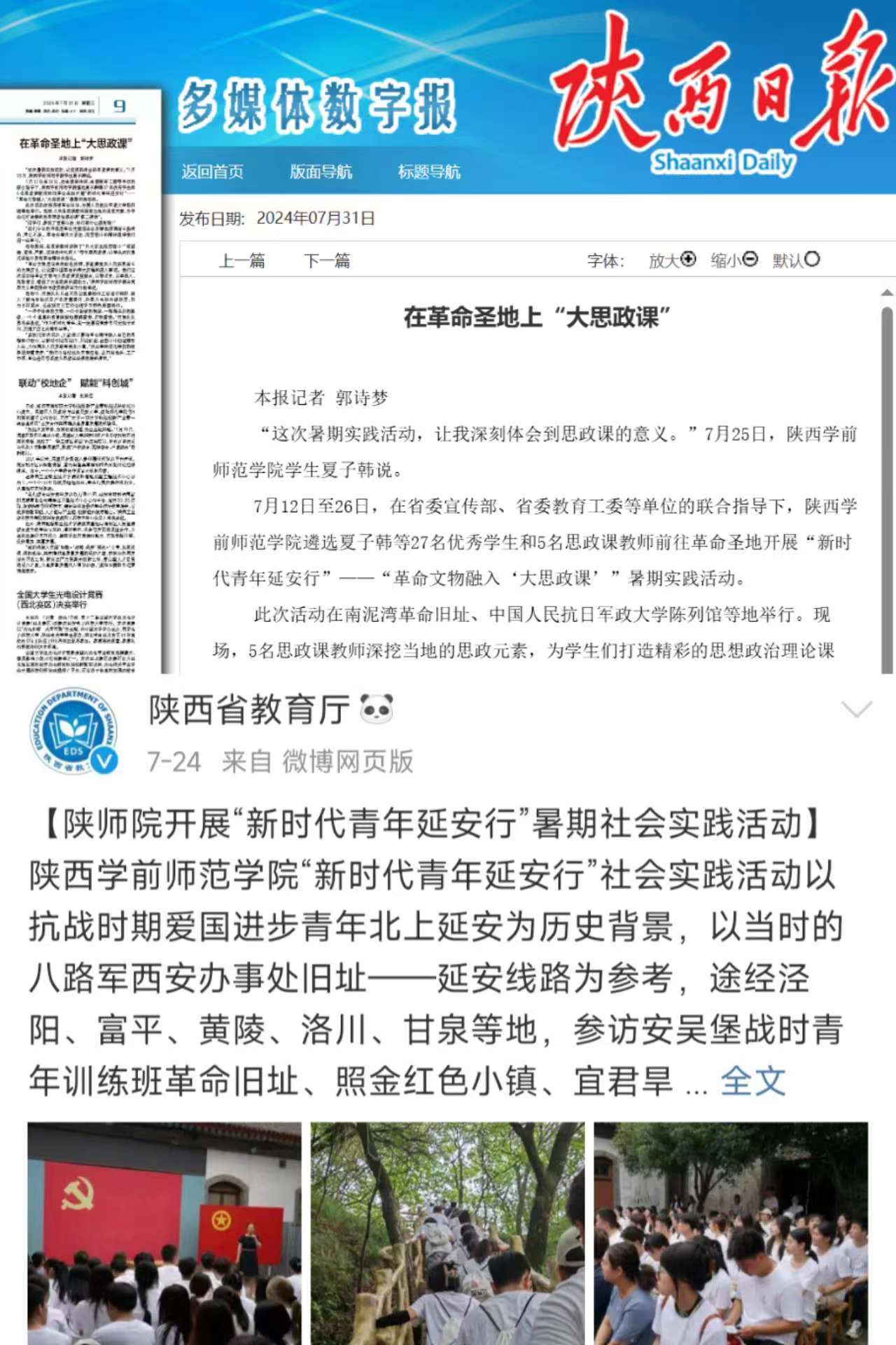 近日,由省委宣传部、省教育工委、团省委、省文物局等单位联合主办的陕西省大学生暑期文化科技卫生“三下乡”社会实践活动暨“新时代青年延安行”革命文物融入“大思政课”实践活动已圆满完成。作为参与本次活动的团队成员之一,beat365遴选了27名优秀学生和5名思政课教师参与活动,活动受到陕西日报、中国青年网、延安电视台、陕西省教育厅微博、西安日报等多家媒体的报道。