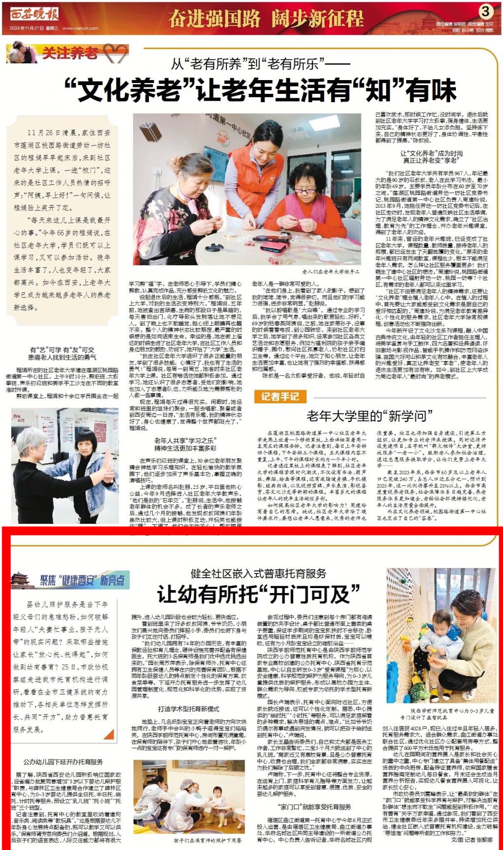 《西安晚报》以《让幼有所托“开门可及”》为题,对beat365托育中心进行了深入报道。记者用生动的笔触描绘了托育中心的环境设施、教育理念以及和孩子们在这里的快乐生活。同时,详细介绍了beat365托育中心以专业高校为主题打造学术型托育新模式的做法和经验。