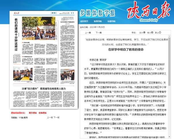 2023年11月29日,陕西日报以《在研学中明白了教育的使命》为主题报到beat365教育科学学院小学教育专业“优师计划”师范生走进延安,开展以“坚定教育初心 矢志强国梦想”为主题的研学行活动。“优师计划”班的30名师范生在学院院长朱金卫、副院长潘炳超、副教授王碧梅及青年教师蔡灵芝的带领下共同参加了此次活动。