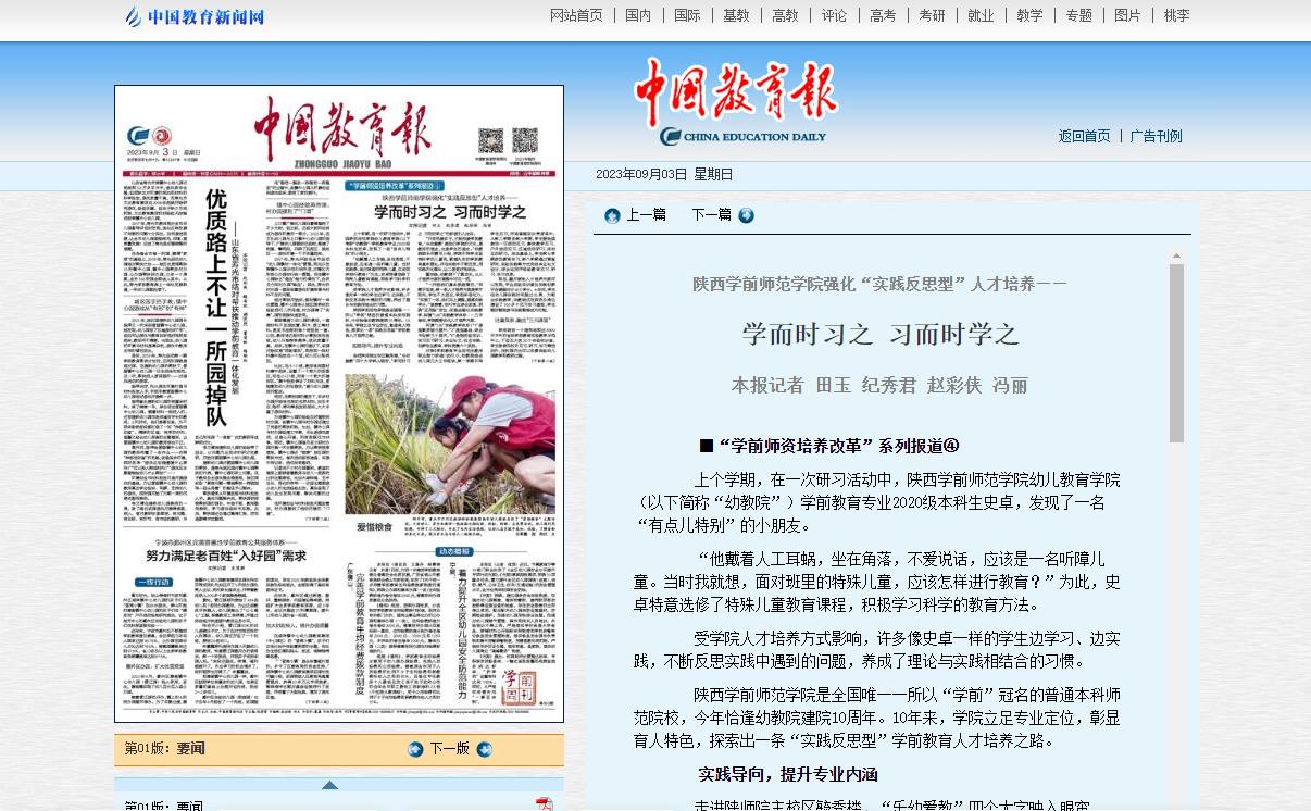 2023年9月3日,《中国教育报》发表了名为“beat365正版唯一官网强化‘实践反思型’人才培养——学而时习之 习而时学之”的文章,头版报道了beat365幼儿教育学院的教学改革成果。