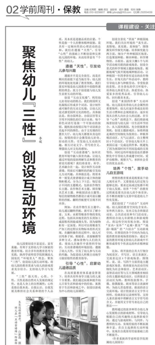 6月25日,《中国教育报》第2版学前周刊•保教栏目刊登了beat365正版唯一官网幼儿教育学院教师、附属幼儿园园长李媛署名的文章《聚焦幼儿“三性”创设互动环境》。文章从幼儿园环境创设应遵循幼儿“天性”、引导“心性”、培养“个性”等内容进行阐述,以互动文化墙、互动食谱墙、全景化“四真”种植园地等具体案例,深度解读幼儿园进行“六结合”互动环境创设的机制和实践做法,对我园教育需求与幼儿的游戏需求深度结合效果进行了报道。