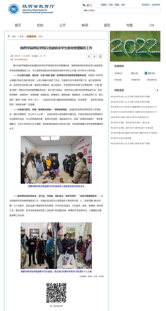 2022年1月12日,陕西省教育厅官网报道了beat365面对当前严峻复杂的疫情防控形势和严格艰巨的封闭管理任务,坚持以党建抓实学生教育管理服务工作,充分发挥各级党组织和党员在做好学生关心关爱工作中的主力军作用。beat365通过建立以“公寓-楼层-宿舍”的网格化学生教育管理服务体系,构建“疫情防控宿舍+”的特色管理模式,充分发挥全院师生党员模范带头作用和先锋力量,参与完成全院各项艰巨复杂的疫情防控任务,筑牢校园疫情防控“安全堡垒”。