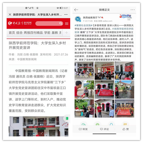 为学习贯彻习近平总书记在庆祝中国共产党成立100周年大会上的重要讲话精神,拓展学校+社会的联动格局,让党的最新理论成果下到基层、深入实际、走进群众,2021年7月,马克思主义学院组建暑期“三下乡”大学生党史学习教育宣讲团赴汉中留坝县江口镇元树村、田坝村、河西社区开展了系列社会实践活动。团队充分发挥专业优势,精心准备宣讲内容,走街串巷,到村入户,讲身边人身边事。宣讲员以点带面,用鲜活生动的案例,活泼幽默的语言,将党史讲得入脑入心,受到了当地干部群众的欢迎,引发了群众的情感共鸣,激发了当地群众爱党爱国爱家乡的热情。宣讲活动开展的同时,大学生们还开展了社会实践调研和志愿支教活动。