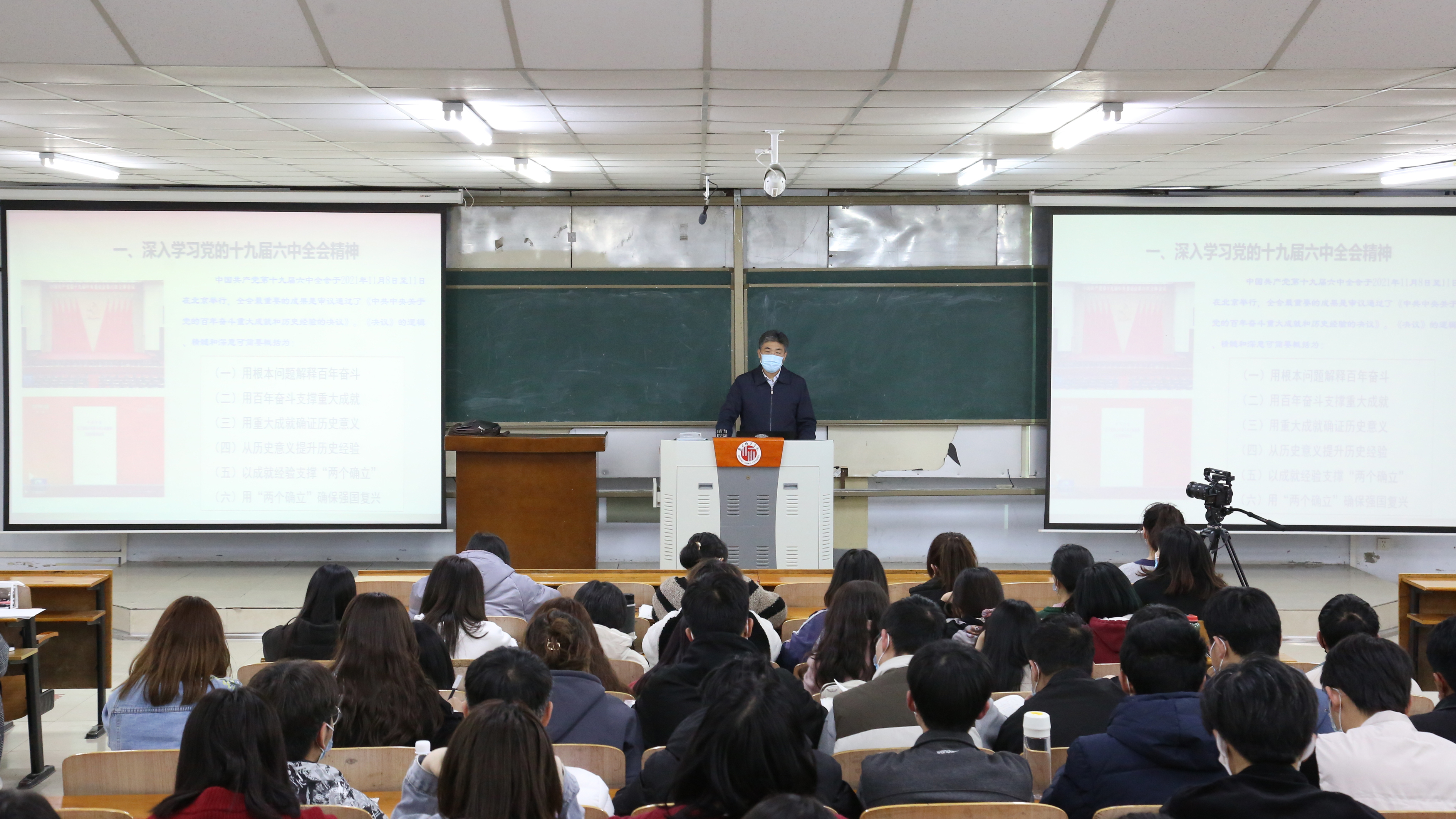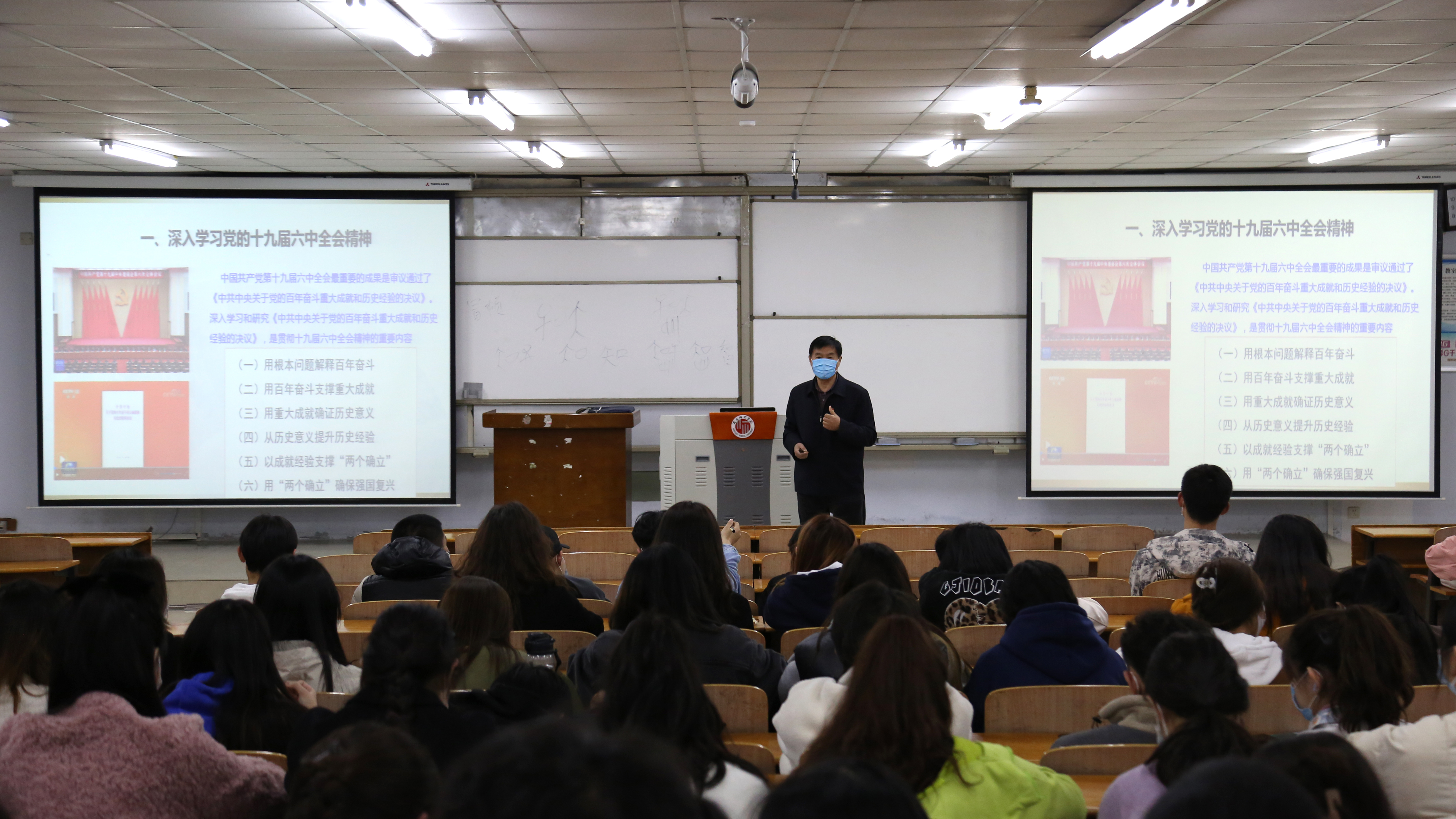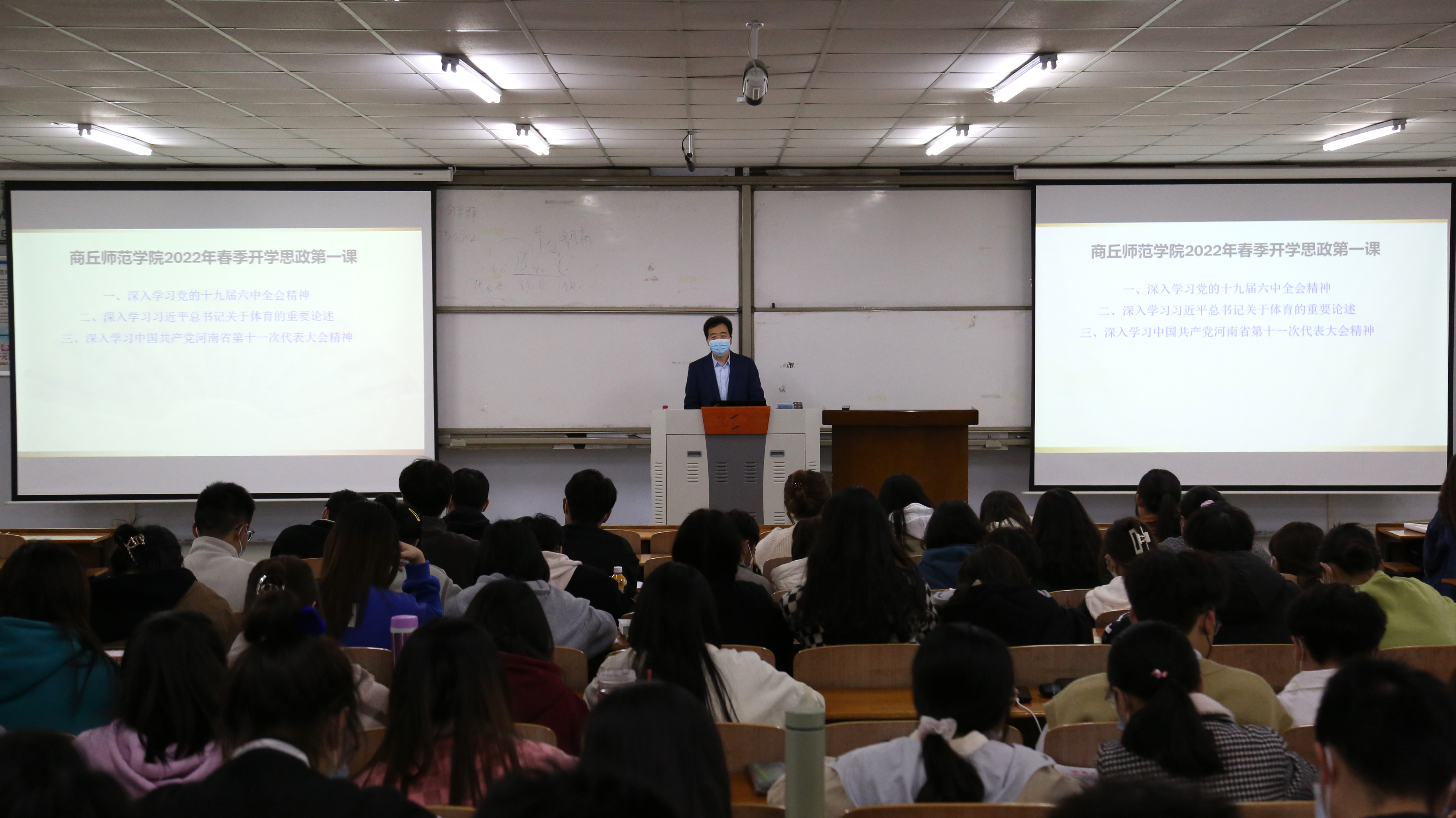 3月27日晚,校党委书记司林胜、校长陈向炜,校领导朱伟、吴金山、徐茂田、辛作义、李永春、郭文佳、程功鹏、张箭为学生讲授党的十九届六中全会精神,习近平总书记关于体育的重要论述,省第十一次党代会精神三个方面内容的春季开学思政第一课。