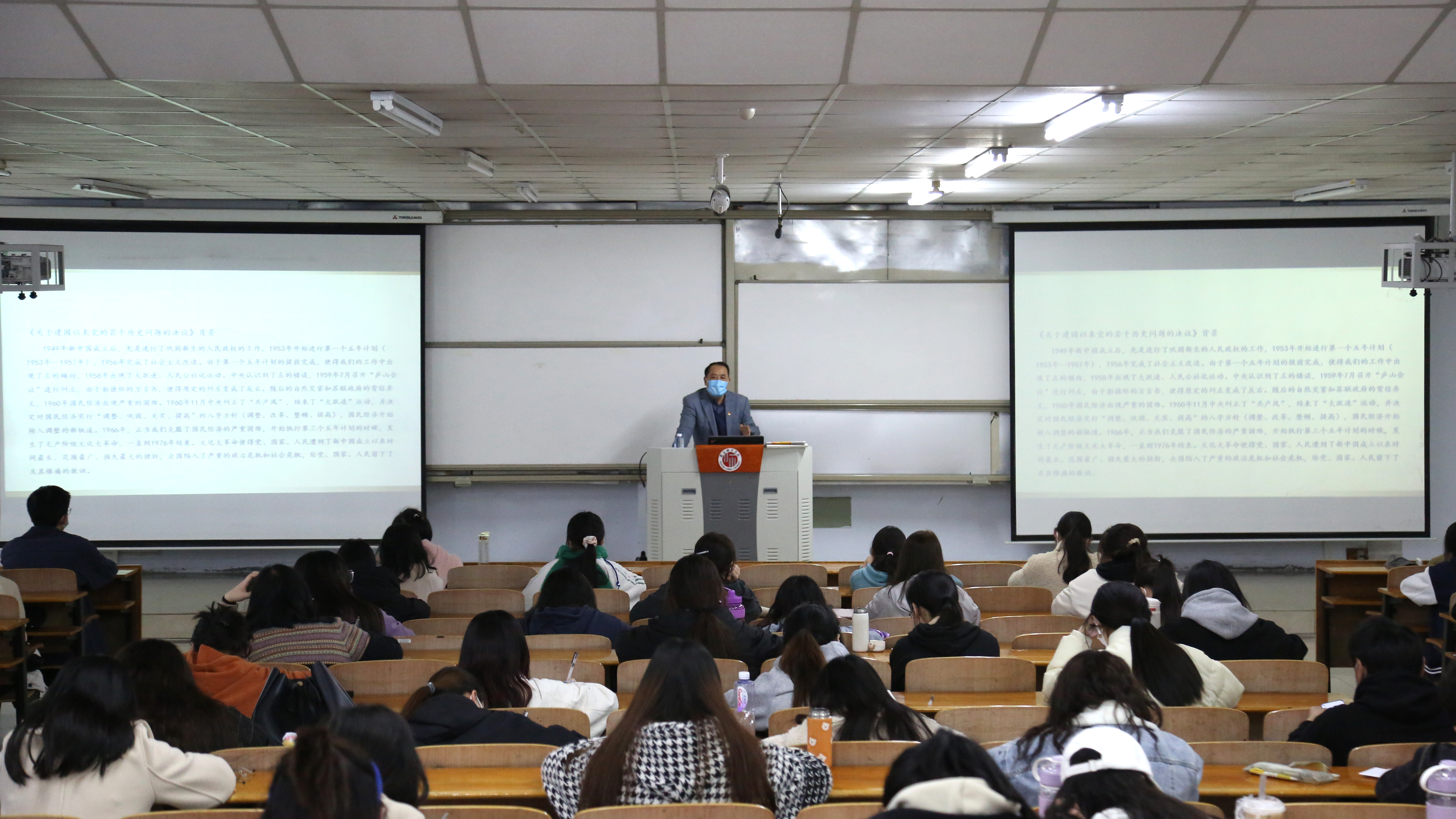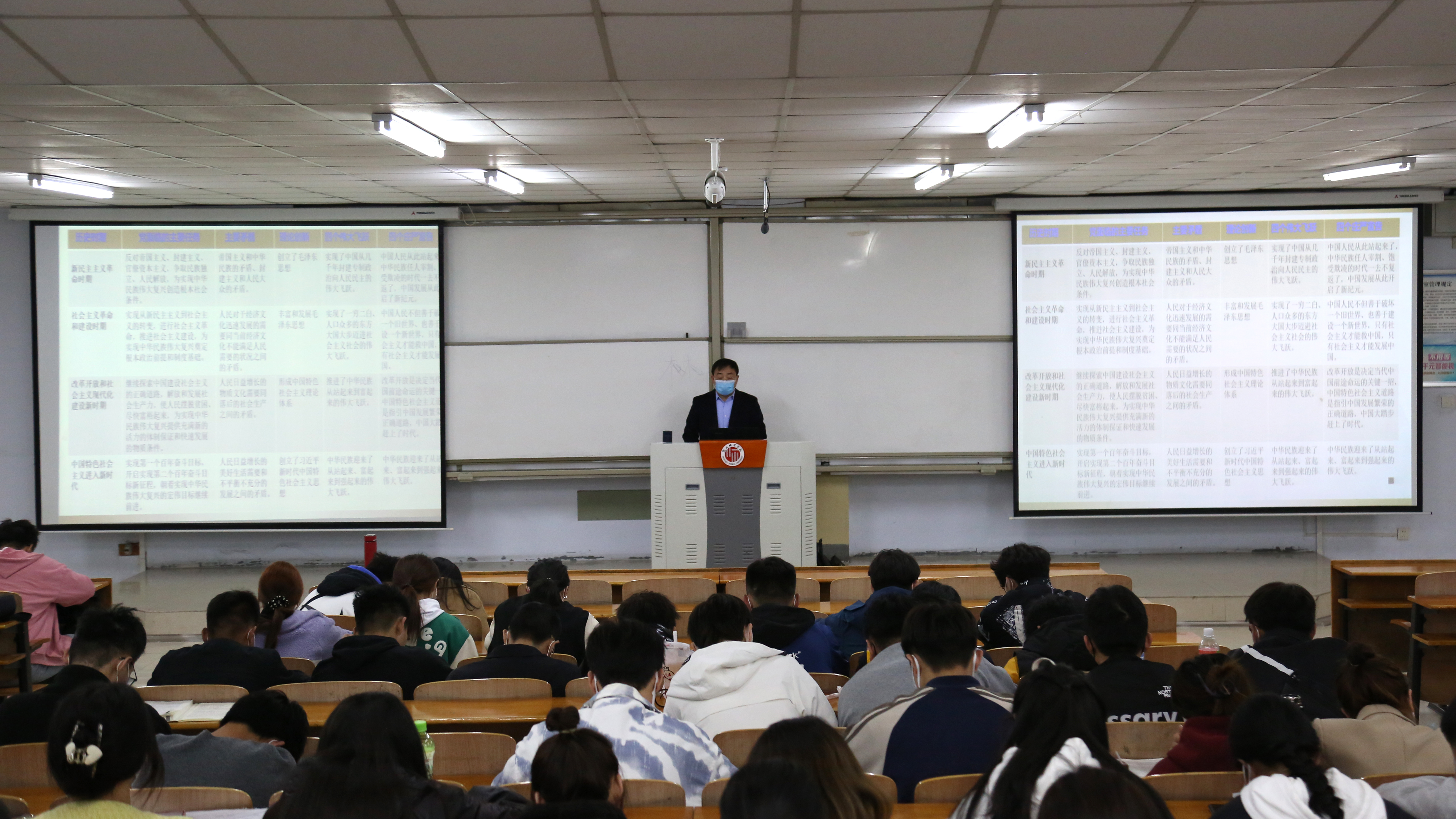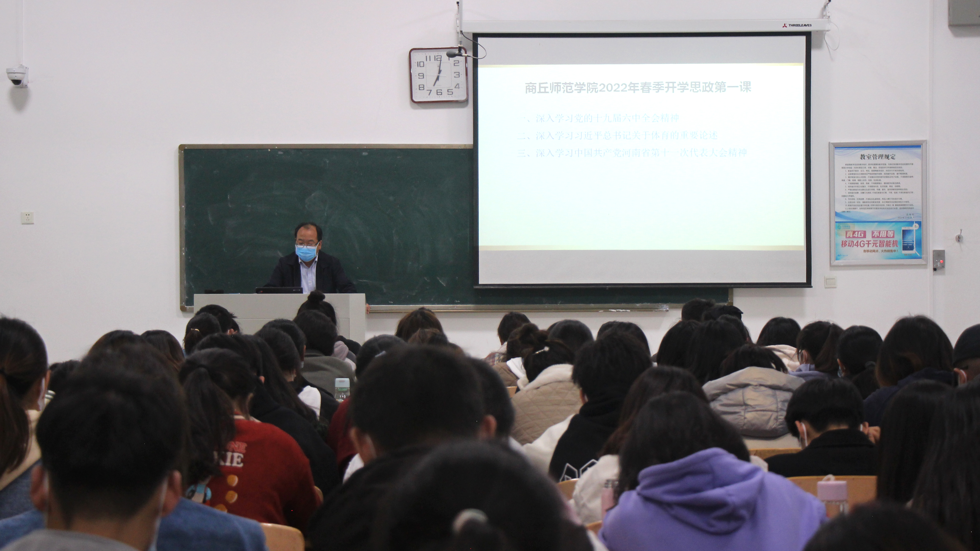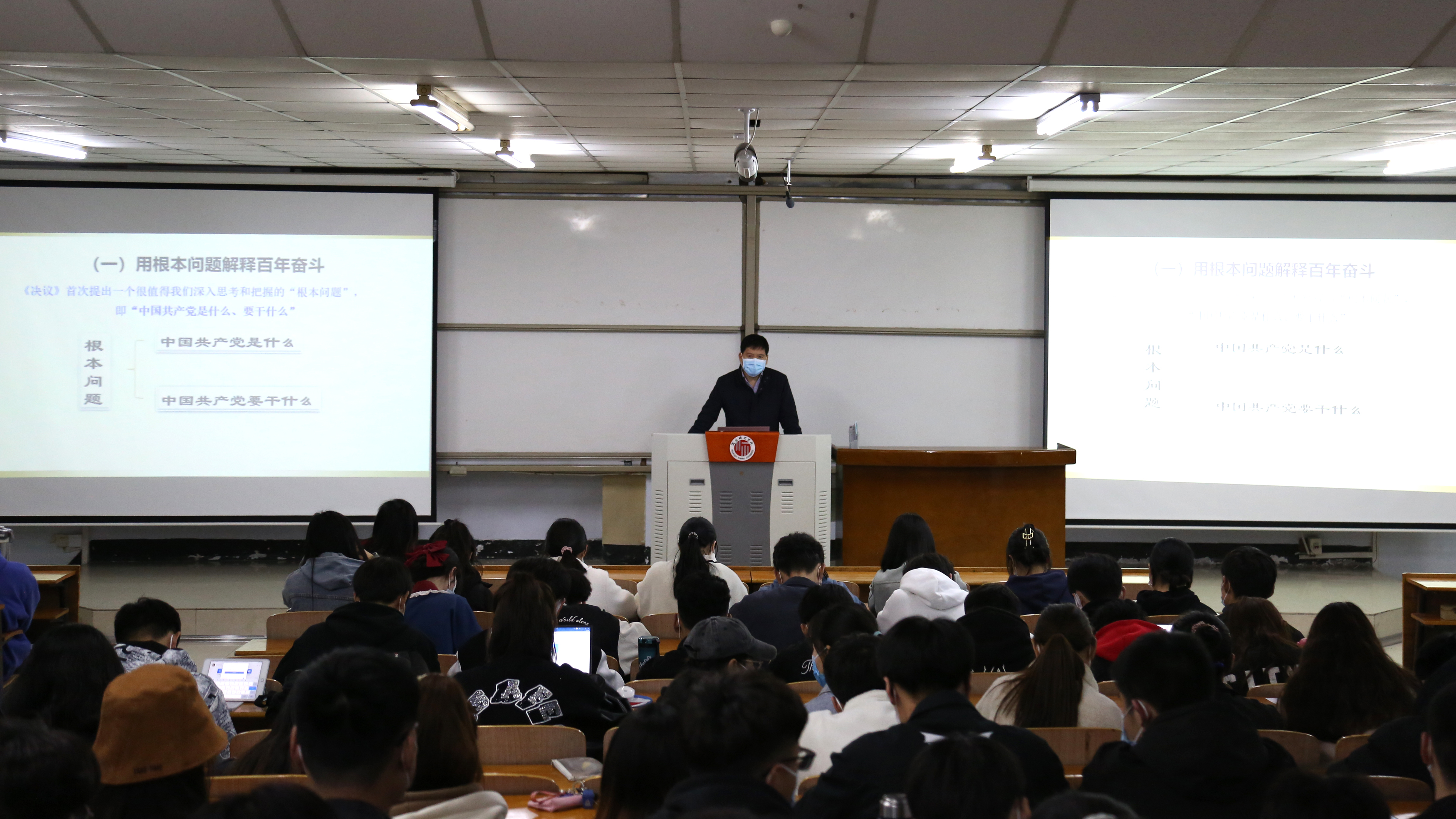 3月27日晚,校党委书记司林胜、校长陈向炜,校领导朱伟、吴金山、徐茂田、辛作义、李永春、郭文佳、程功鹏、张箭为学生讲授党的十九届六中全会精神,习近平总书记关于体育的重要论述,省第十一次党代会精神三个方面内容的春季开学思政第一课。