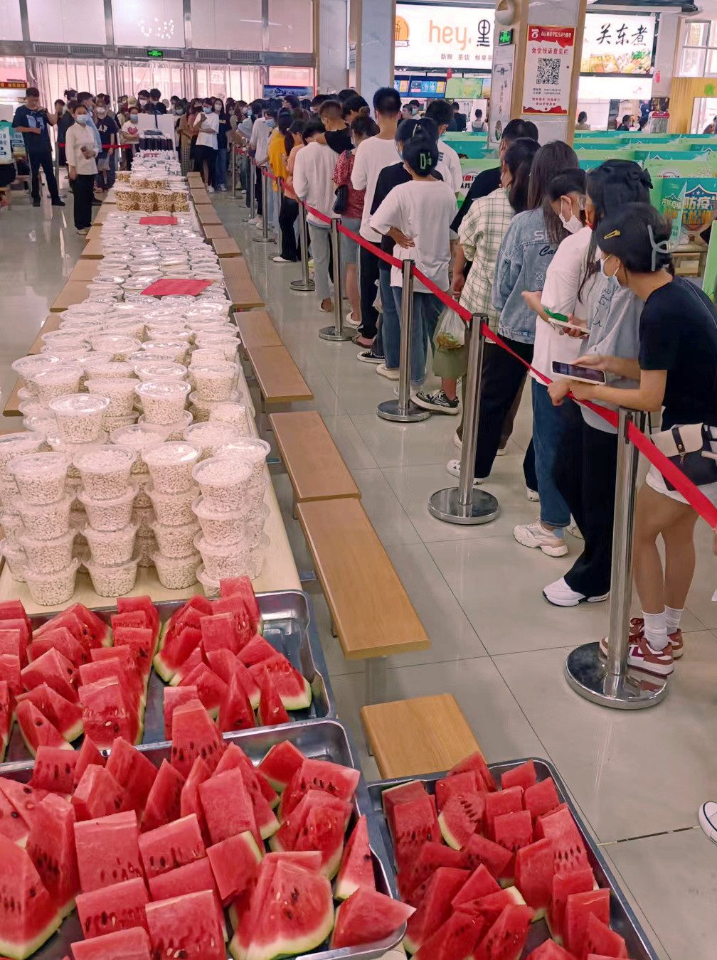 8米长庆国庆蛋糕1个、砂糖馅1000份、西瓜2000斤、爆炸玉米花500份、爆炸大米花500份、麻辣香锅50份、生汆丸子汤50份、菜煎饼100份、酱鸭面50份、水果捞150份、豆浆100份、酸梅汤100份、烤冷面60份、饭团50份、网红烤肠50份、摇滚炒鸡50份、脆皮炸年糕100份、酸奶饮品2700杯、大枣500斤、圣女果300斤、葡萄200斤、巧克力2000个、自制烘焙点心100斤、1000份小面包锅巴、 3000元(1-5元)不等代金券,300张每人单份半价优惠券。