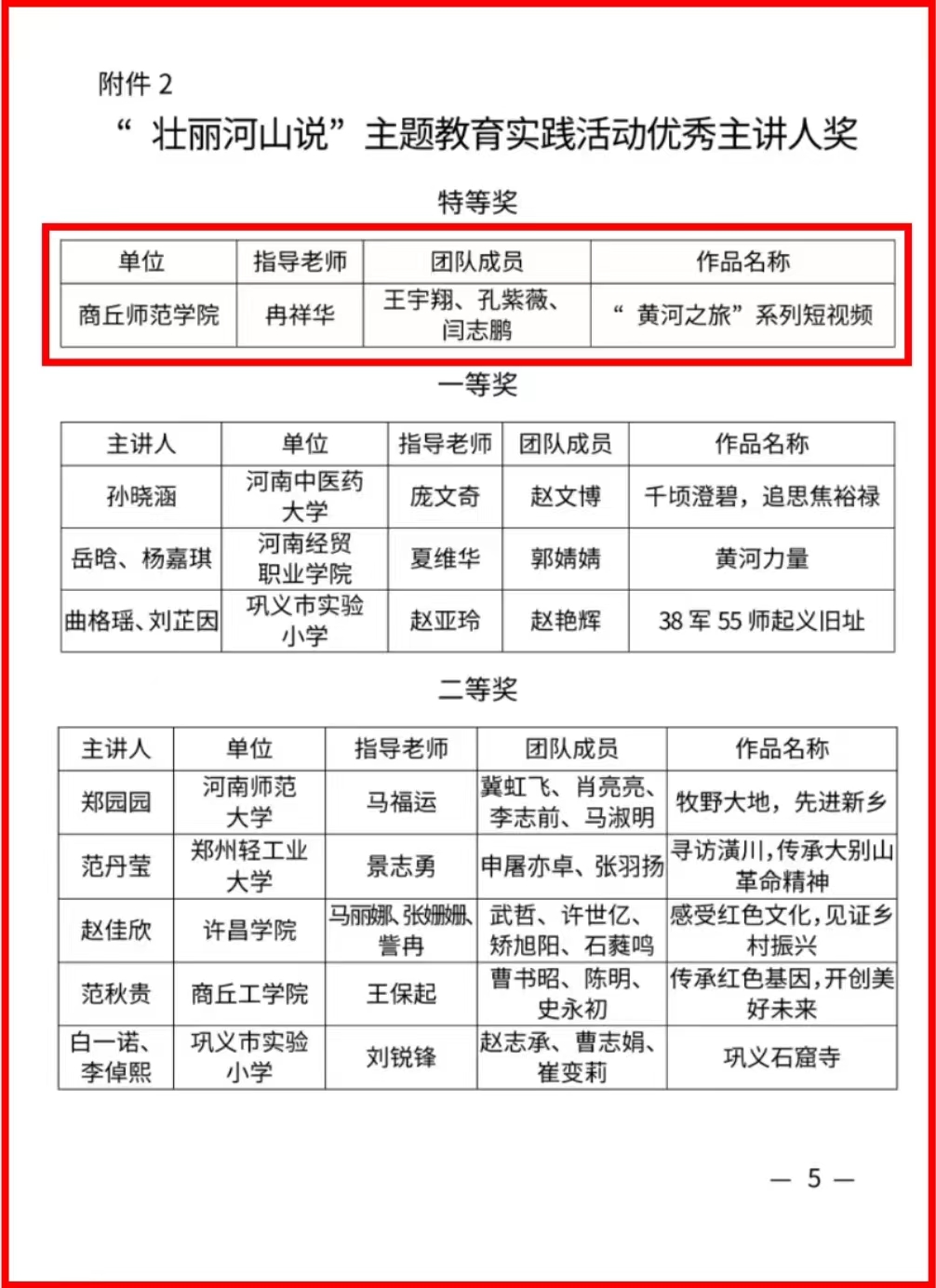 近日,中共河南省委教育工委、河南省教育厅公布了“壮丽河山说”主题教育实践活动获奖结果(豫教工委办〔2022〕55号),纽约国际官网党委宣传部主持拍摄制作的“黄河之旅”10集系列短视频,荣获主题教育实践活动中全省唯一特等奖。