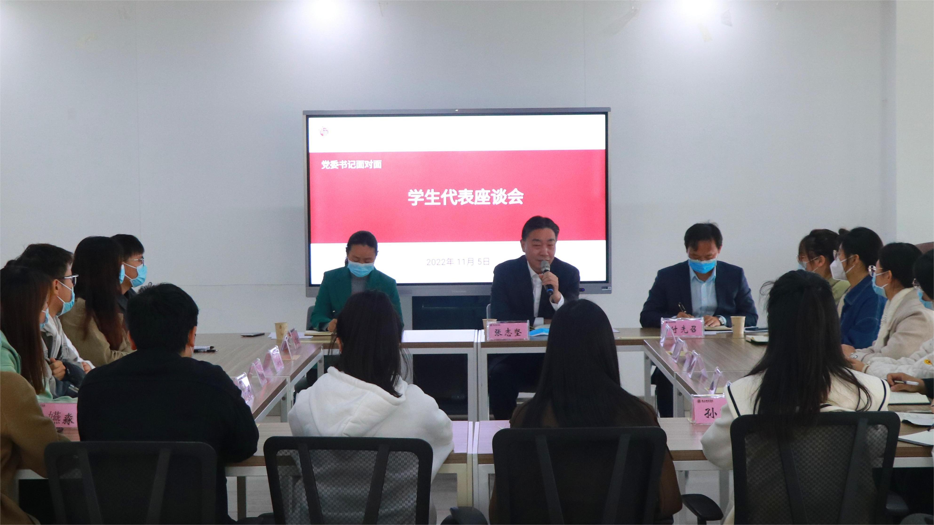 座谈会现场气氛热烈。辅导员代表围绕学生思想政治教育、心理健康教育、学生日常事务管理、学生成长成才等方面畅所欲言,交流了工作中的思考收获,对学校建设发展提出了积极的意见与建议。学生代表围绕学习生活、教育教学、自身成长、疫情防控等方面分享了自己的体会感悟,也提出了存在的问题和困惑。张志坚认真倾听、详细记录、耐心解答。他指出,通过座谈听取大家真实想法,对学校发展建言献策,最终目的是解决问题。大家提出的意见建议,学校能够立即解决的将迅速解决,不能立即解决的问题,通过研判分析、协同推进、尽快解决。