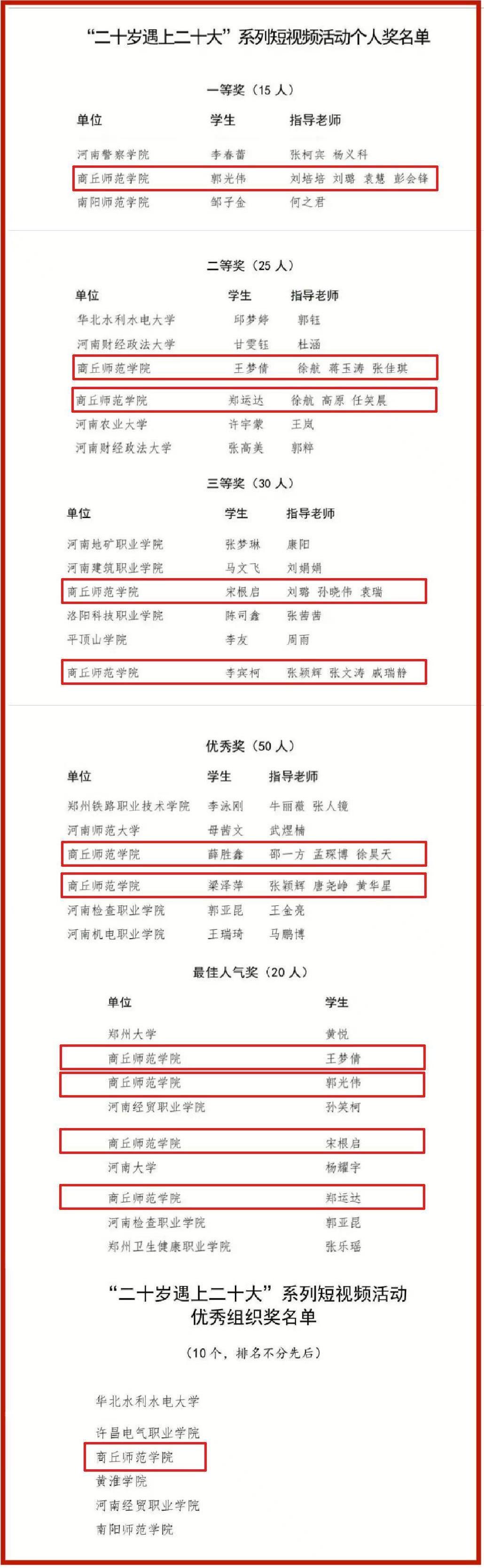 近日,由河南省委教育工委、河南省教育厅、河南广播电视台联合主办的“二十岁遇上二十大”系列短视频活动获奖名单公布,纽约国际官网报送的7部短视频作品全部获奖,其中,获一等奖1项,二等奖2项,三等奖2项,优秀奖2项,最佳人气奖4项,纽约国际官网获优秀组织奖。