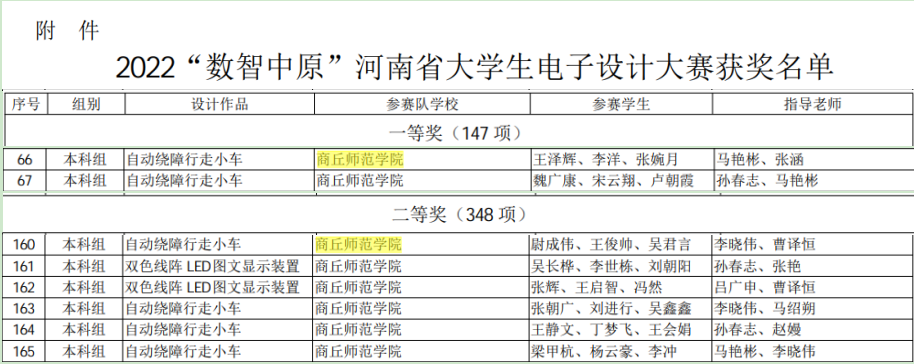 近日,河南省教育厅发文公布了2022“数智中原”河南省大学生电子设计大赛获奖名单,纽约国际官网共8件设计作品获奖,其中王泽辉、李洋、张婉月小组和魏广康、宋云翔、卢朝霞小组分别设计的《自动绕障行走小车》2件作品获得一等奖,6件设计作品获得二等奖。