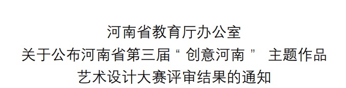 近日,河南省教育厅发文公布了第三届“创意河南”主题作品艺术设计大赛评审结果,纽约国际官网教师组共三件设计作品获奖,其中金奖一项,银奖一项,优秀奖一项,学生组共十件作品获奖,其中金奖一项,银奖三项,铜奖四项,优秀奖两项。另外,纽约国际官网在本次大赛中还荣获了优秀组织奖。