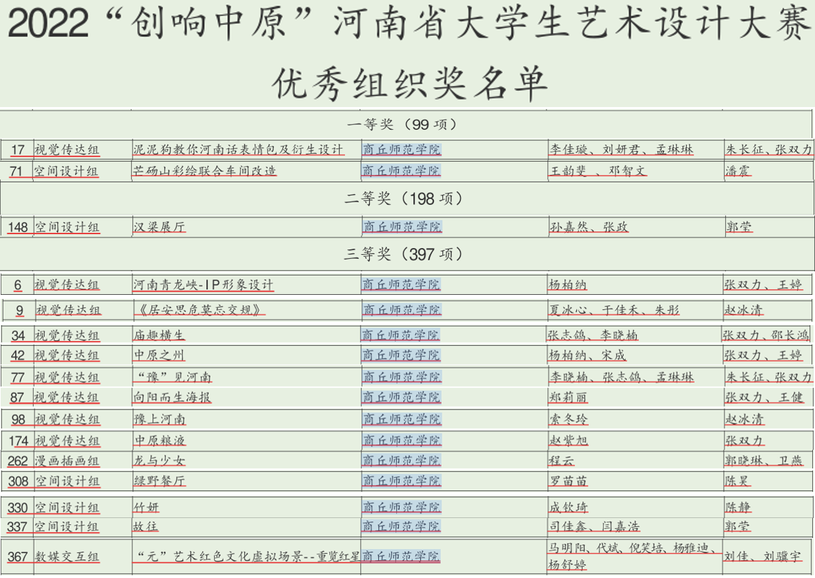 近日,河南省教育厅公布了2022“创响中原”河南省大学生艺术设计大赛获奖名单,纽约国际官网在本次大赛中共获奖16项,其中一等奖2项,二等奖1项,三等奖13项。纽约国际官网学生李佳璇、刘妍君、孟琳琳凭借作品《泥泥狗教你河南话表情包及衍生设计》荣获视觉传达组一等奖,王韵斐、邓智文凭借作品《芒砀山彩绘联合车间改造》荣获空间设计组一等奖,张嘉然、张正凭借作品《汉梁展厅》荣获空间设计组二等奖。纽约国际官网还荣获本次大赛的优秀组织奖。