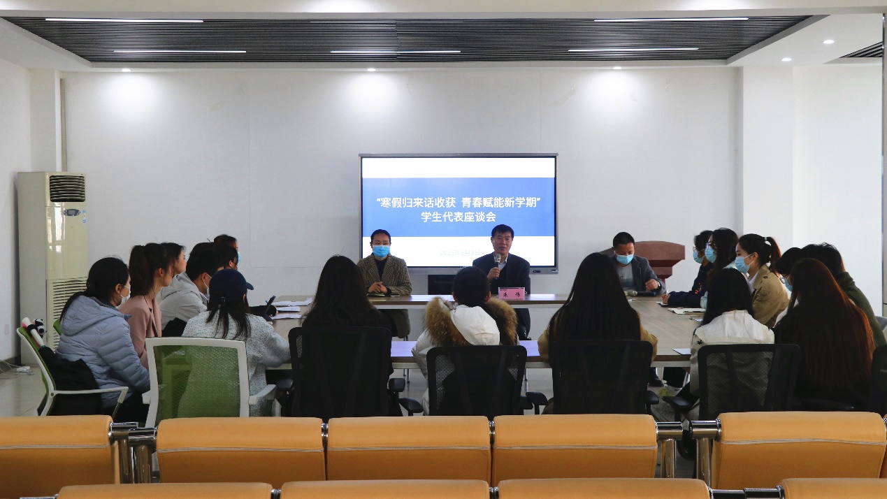 座谈会上,学生代表与老师面对面,讲成长、谈理想、话收获。各学院学生代表分别分享寒假体会和心得感悟,假期中同学们深入学习宣传贯彻党的二十大精神,积极参与社会实践,将自身发展融入理论宣讲、健康宣传、学业帮扶、助农活动等工作中,为家乡的发展贡献一份力量。同时,同学们提出了自己在新学期的新目标,为未来更好的发展做好新规划。