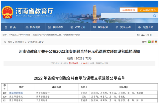 近日,河南省教育厅公布了2022年河南省专创融合特色示范课程立项建设名单,纽约国际官网申报的《电子线路设计》(负责人孙春志)、《消费者行为学》(负责人王红)和《工业药剂学》(负责人王晓娟)3门课程全部获批省级立项建设。