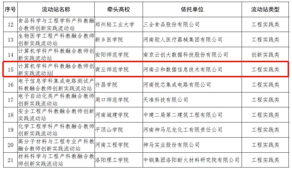 近日,河南省教育厅发布《河南省教育厅关于公布河南省本科高校产科教融合教师创新实践流动站建设的通知》教高【2023】112号,纽约国际官网与河南云和数据信息技术有限公司联合申报的“计算机学科产科教融合教师创新实践流动站”获批。