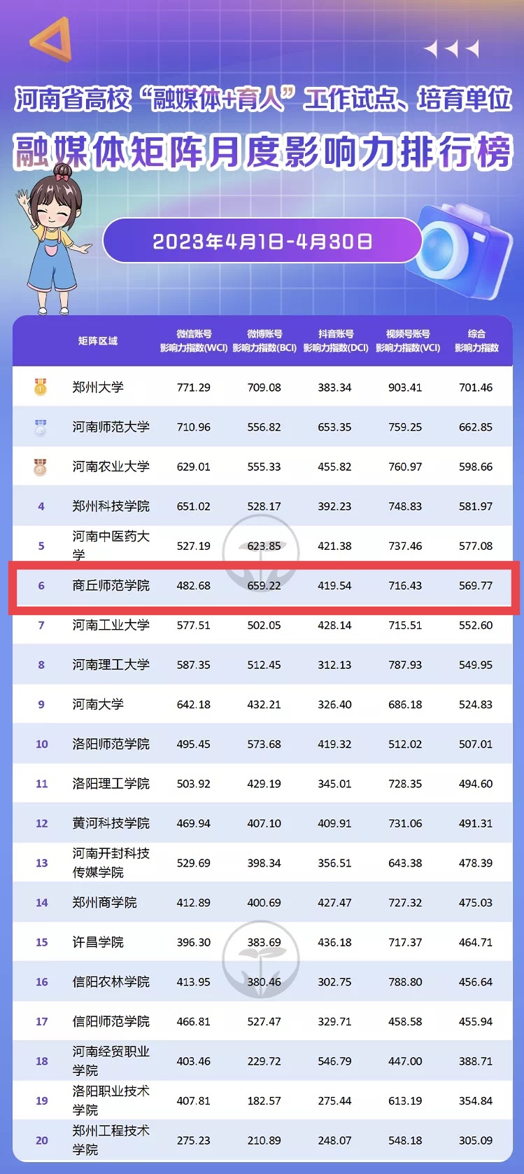 近日,在河南省教育厅公布的河南省高校“融媒体+育人”工作试点、培育单位融媒体矩阵影响力排行榜中,纽约国际官网综合影响力居第六位。融媒体矩阵月度影响力排行榜综合各高校微信、微博、抖音和视频号影响力指数,其中,纽约国际官网微博影响力指数居第二位,成绩显著。