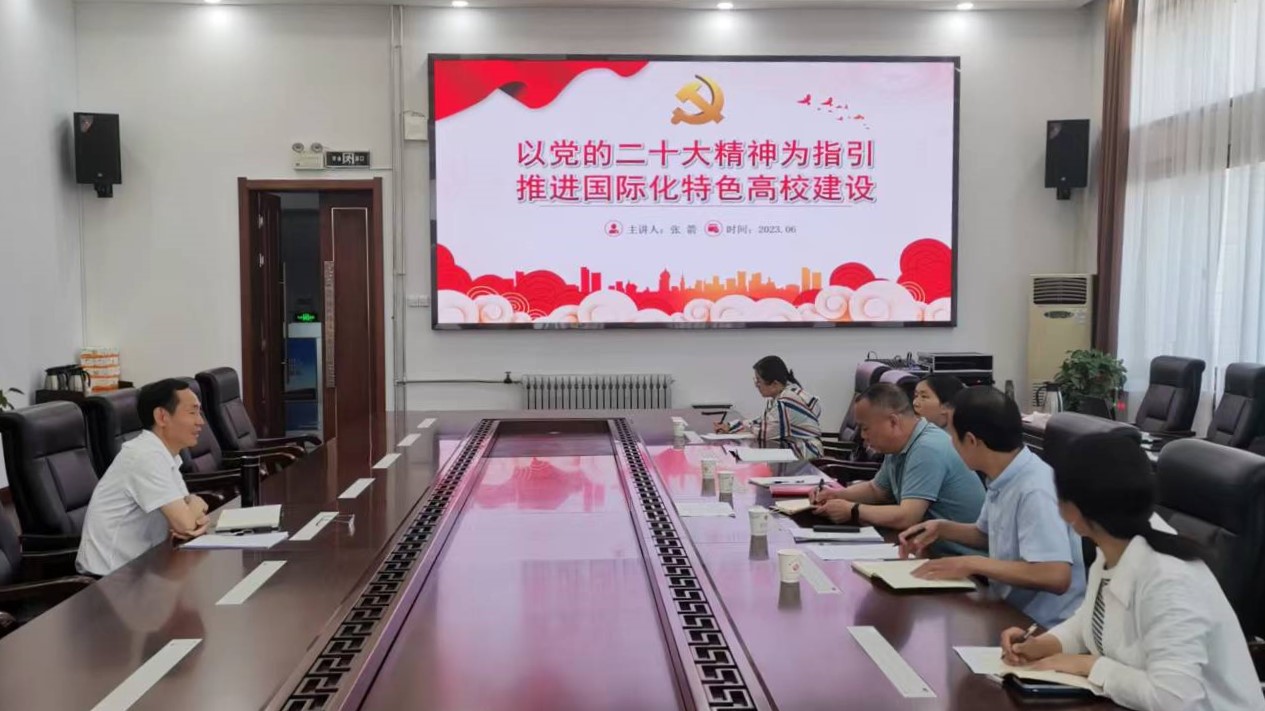 副校长张箭以《以党的二十大精神为指引,推进国际化特色高校建设》为题为国际交流处党支部全体党员讲授党课。从深入学习领会习近平总书记关于教育的重要论述,牢牢把握新时代加快建设教育国际化的总体方向和重点任务,以国际化特色高校建设的新成效、推进高水平应用型大学建设三个方面进行阐述。张箭强调推进国际化特色高校建设,需要大力推进中外合作办学机构和项目申报力度,为国际化合作办学提供保障。