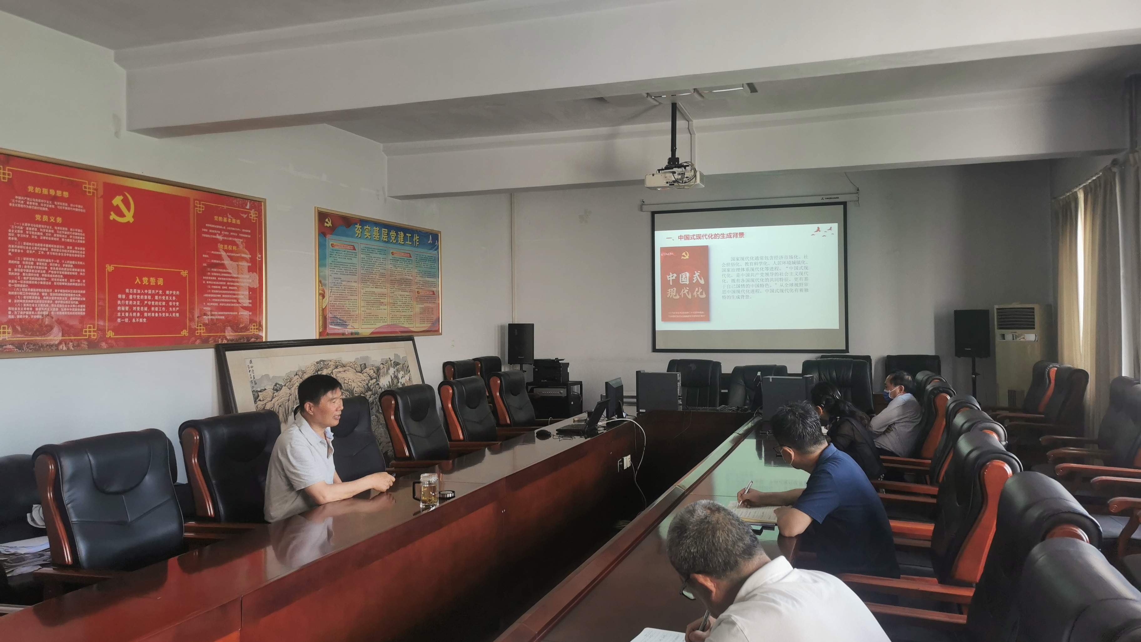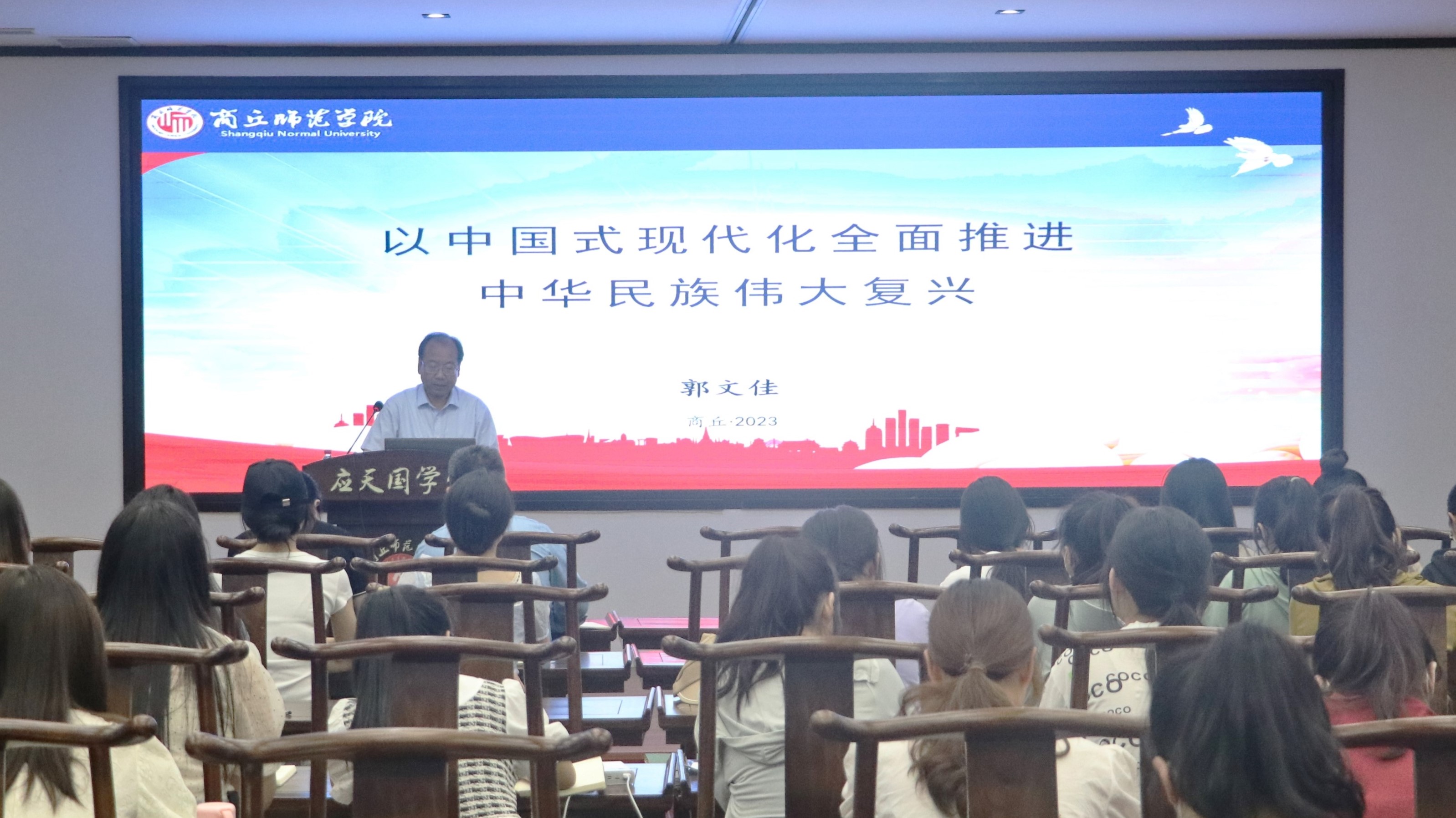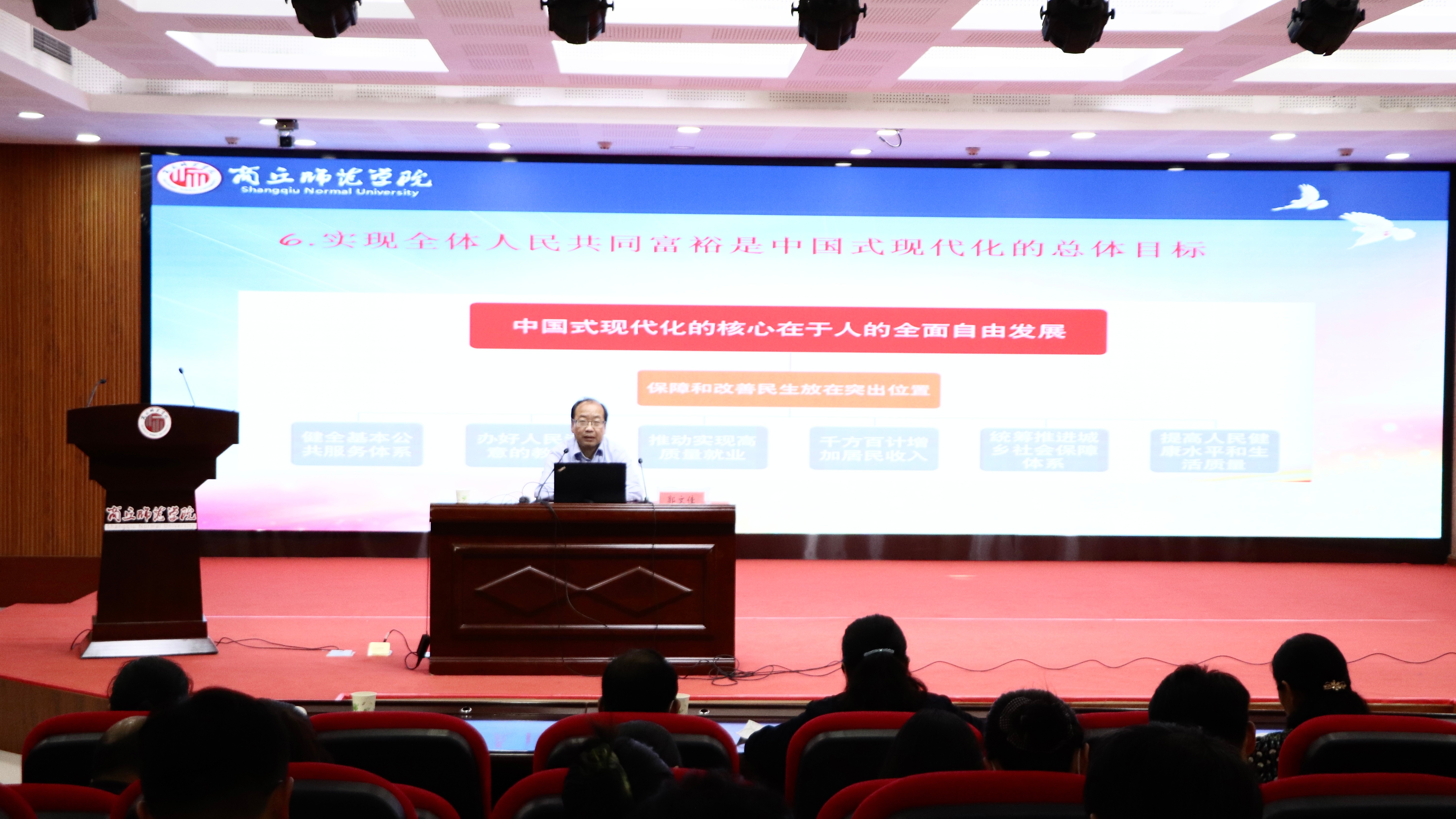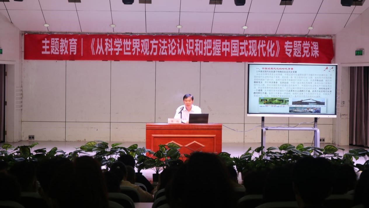 副校长郭文佳以《以中国式现代化全面推进中华民族伟大复兴》为题为分管部门和联系学院讲授党课。重点围绕深刻把握中国式现代化的中国特色、牢牢把握中国式现代化的本质要求、中国式现代化是实现中华民族伟大复兴的光明大道展开论述,引导教师党员准确认识和把握中国式现代化的重大意义与科学内涵,让大家对中国式现代化的发展、未来前瞻和实现途径等方面有了一个更加直观的了解。
