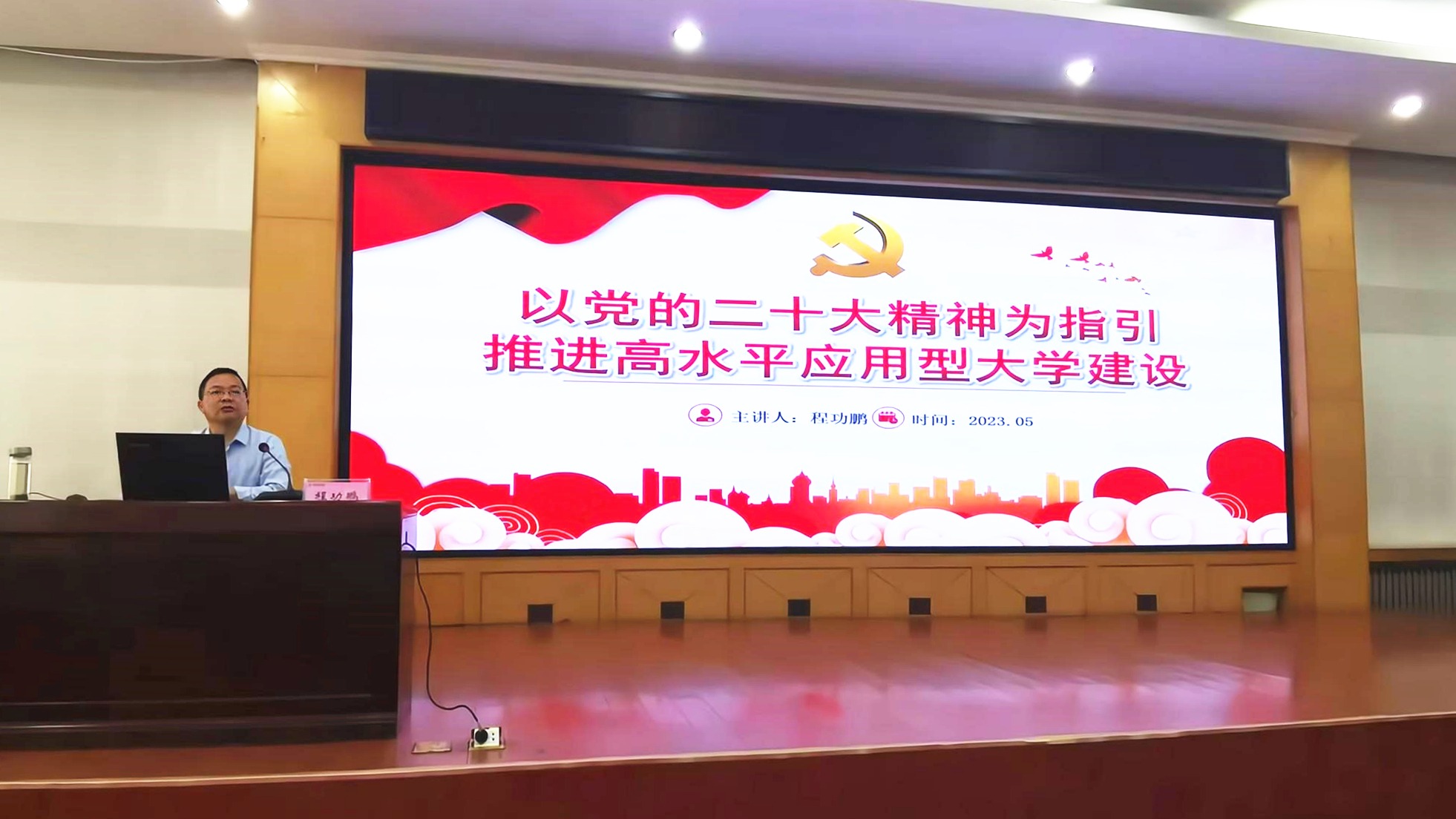 副校长程功鹏以《以党的二十大精神为指引 推进高水平应用型大学建设》为题为分管部门和联系学院讲授党课。以贯彻落实党的二十大精神为主线,从深入学习领会习近平总书记关于教育的重要论述、新时代加快建设教育强国的总体方向和重点任务、高水平应用型大学建设的战略重点三个方面进行了详细讲解。他强调,要深刻把握新时代加快建设教育强国的总体方向和重点任务,紧紧扭住高水平应用型大学建设的战略重点,抢抓机遇,踔厉奋发。