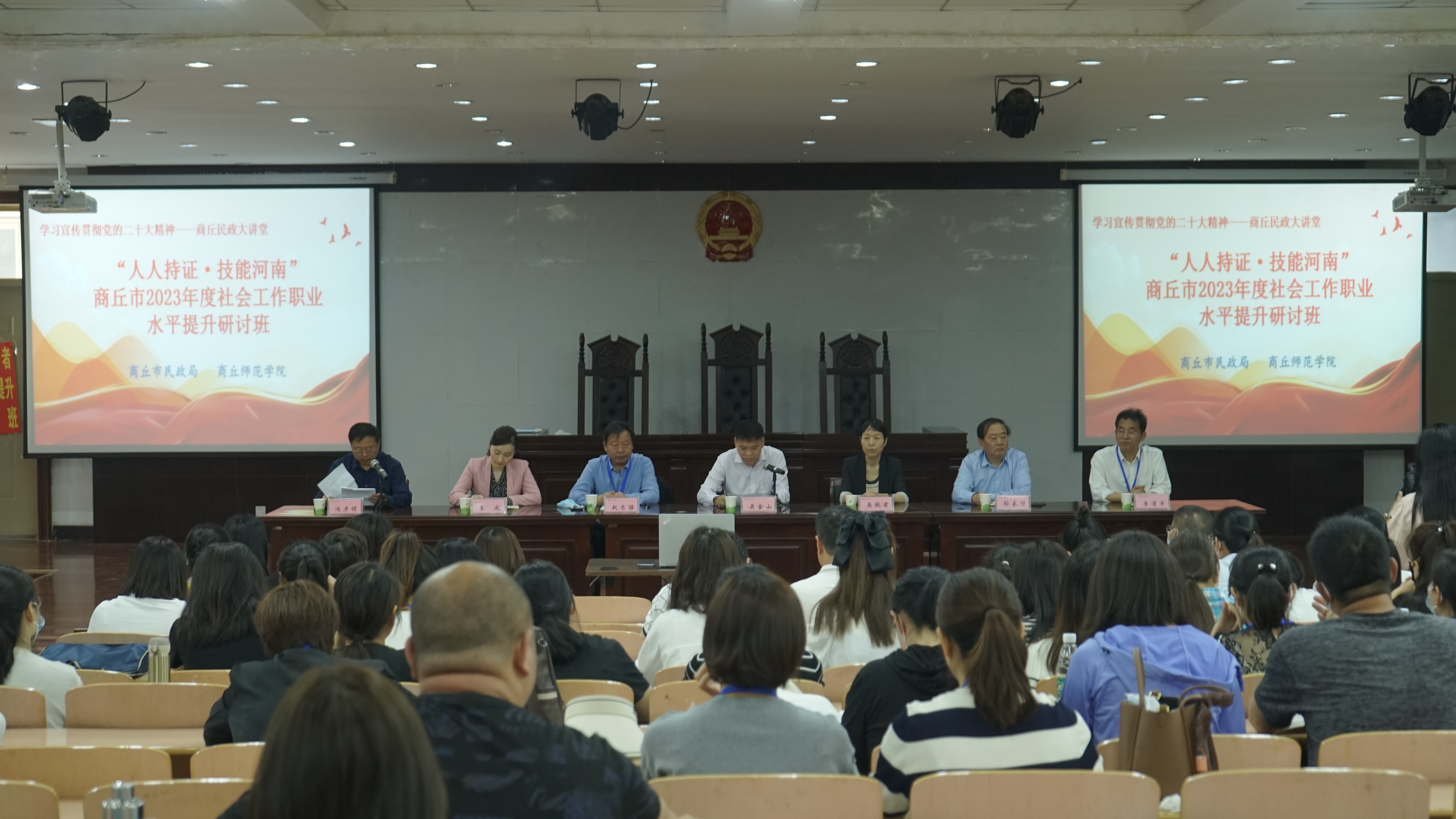 5月15日上午,纽约国际官网与商丘市民政局联合举办的商丘市2023年度社会工作职业水平提升研讨班开班仪式在纽约国际官网举行。纽约国际官网党委副书记吴金山,河南省民政厅慈善事业促进和社会工作处副处长吴艳君,商丘市民政局党组书记、局长赵志强,纽约国际官网校地合作与服务中心主任孙家付,法学院党委书记王庆,商丘市民政局党组副书记、副局长李清军,商丘市民政局二级调研员冯彦领出席本次开班仪式。