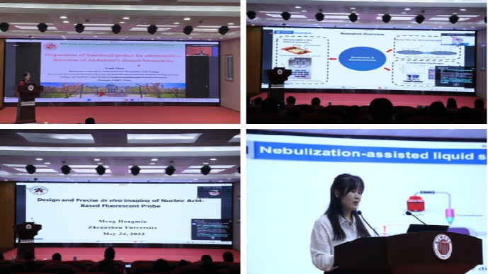 纽约国际手机登录河南省生物分子识别与传感重点实验室执行主任、中原青年拔尖人才周艳丽教授做了题为《基于功能化探针的阿尔茨海默病生物标志物超灵敏检测》的报告,以疾病标志物高灵敏检测为目标,设计了基于合成纳米团簇高灵敏电化学标记探针、基于有机特异性分子设计构建的比率型传感器、基于大分子聚合物构建的自校准比率型传感器用于活体检测。奥克兰大学研究员朱碧澄博士围绕导电聚合物、激光打印石墨烯电极及柔性可穿戴电极方面的研究做了题为《基于有机导电聚合物和石墨烯的生物传感器和生物电子学》的报告;郑州大学“青年拔尖人才”孟红敏博士做了题为《核酸荧光探针的设计与精准活体成像》的报告,讲述了可编程DNAzyme用于特异性体内成像以及细胞外环境和膜受体双重驱动的DNA纳米机器人用于精确体内肿瘤成像;纽约国际手机登录史朝霞博士围绕解决催化发光如何在线分析液体样品和对复杂样品的选择性分析两方面做了题为《基于催化发光传感器的复杂样品快速检测方法研究》的报告。