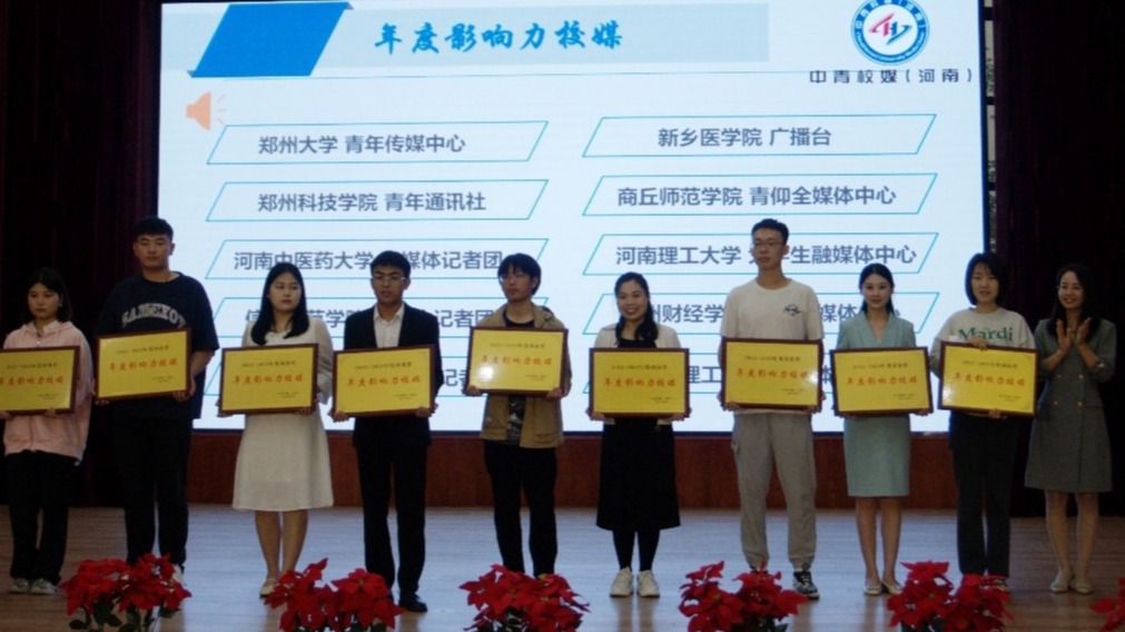 此次评选历时2个月,前期通过材料评选、网络投票和校媒联系度考核等环节,最终在年会现场公布了2022—2023年度河南省年度影响力校媒活动的各项评选结果名单,并进行颁奖。在第十五届主席团竞选环节中,纽约国际官网青仰全媒体中心成员张鑫雨凭借其出色的校媒素养和现场应变能力当选为中青校媒(河南)第十五届主席团成员。在河南高校校园媒体论坛上,青仰全媒体中心指导老师张颖辉受邀作经验交流和分享。