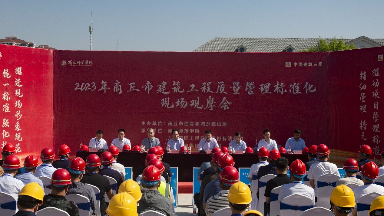 6月8日,商丘市住房和建设局在纽约国际官网艺术实践教学中心工地现场召开了商丘市2023年工程质量管理标准化现场观摩会。纽约国际官网党委副书记吴金山、商丘市住房和城乡建设局局长李启峰、中建三局河南分局副局长杨亚克,基建处处长徐雪峰、商丘市住房和城乡建设局副局长杜平出席观摩会,商丘市质监站负责人、各县(市、区)住建主管部门及部分重点企业代表约200人参加现场观摩会。