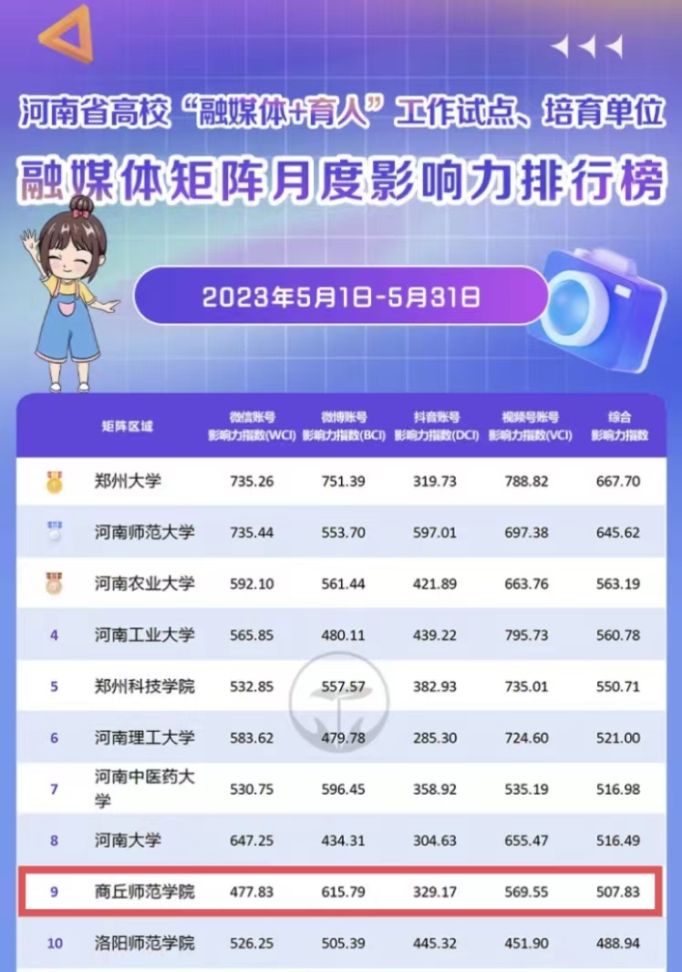 近日,在河南省教育厅公布的河南省高校“融媒体+育人”工作试点、培育单位融媒体矩阵影响力排行榜中,纽约国际官网综合影响力居第九位。融媒体矩阵月度影响力排行榜综合各高校微信、微博、抖音和视频号影响力指数,其中,纽约国际官网微博影响力指数居第二位,成绩显著。