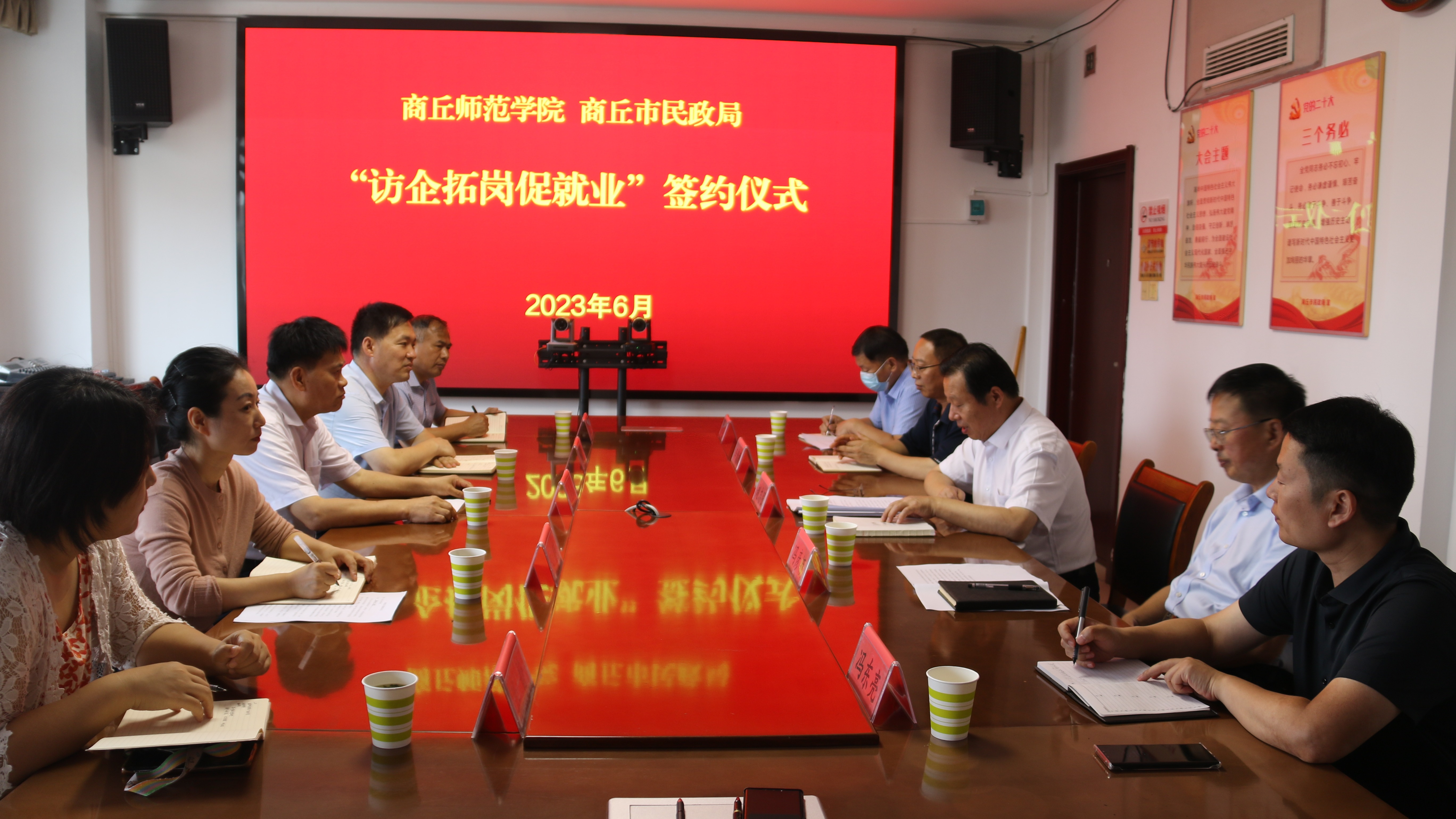 6月28日,校党委副书记吴金山带队到商丘市民政局开展访企拓岗促就业活动。商丘市民政局党组书记、局长赵志强,二级调研员冯彦领及相关科室负责人,法学院负责同志参加活动。