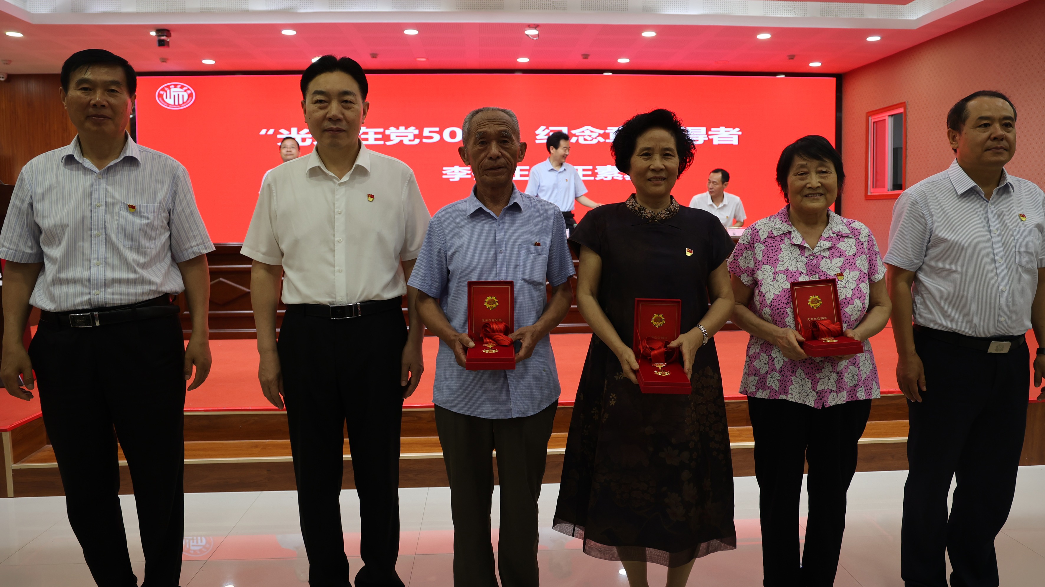党委书记张志坚,党委副书记、工会主席朱伟、副校长辛作义为纽约国际官网三位老党员颁发“光荣在党50年”纪念章。