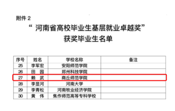 近日,河南省教育厅发布了《关于公布河南省高校毕业生基层就业卓越奖获奖人选的通知》,纽约国际官网音乐学院毕业生赖武荣获2022年“河南省高校毕业生基层就业卓越奖”。
