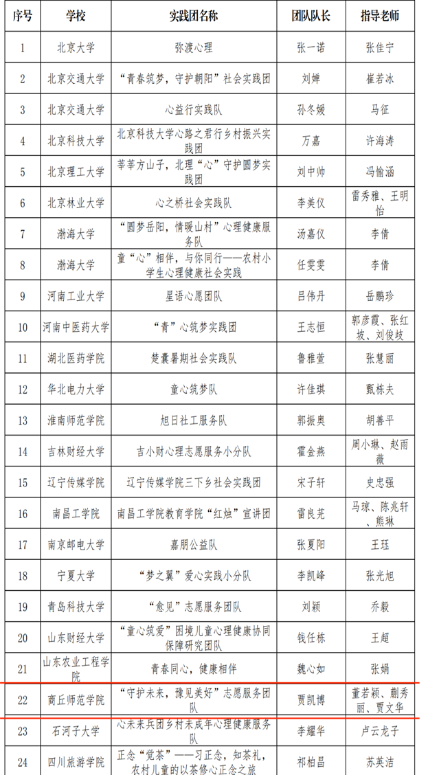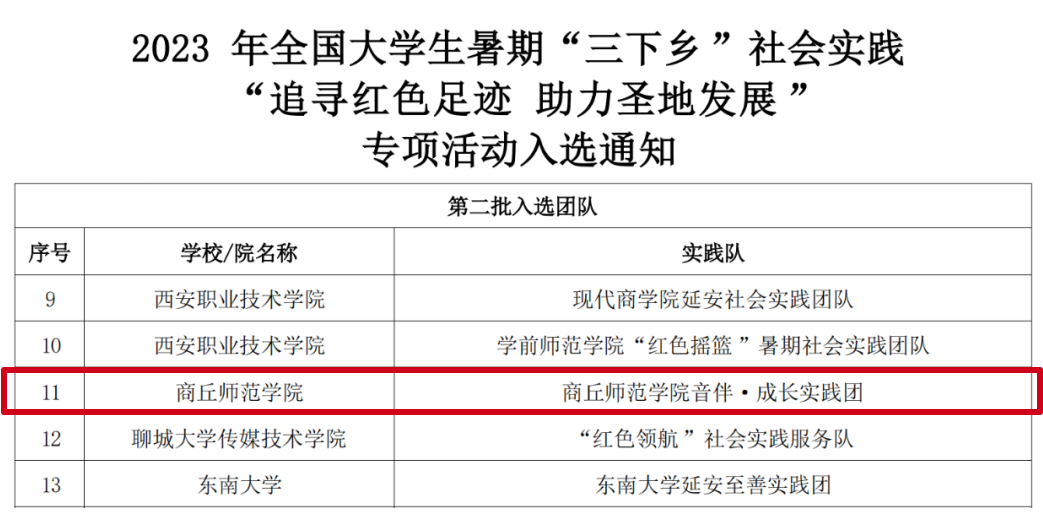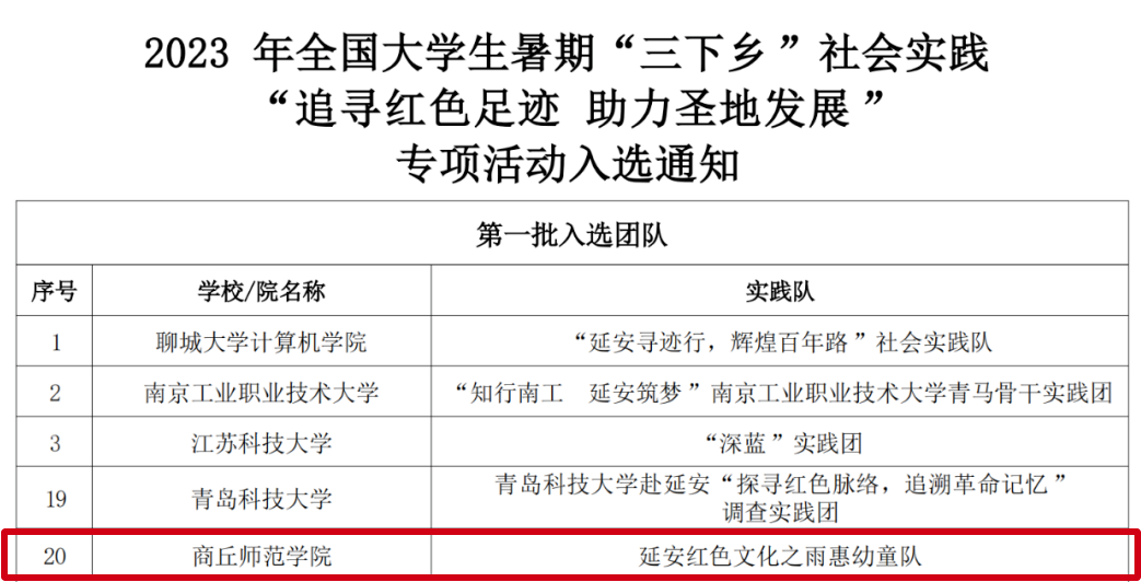 青春三下乡,奋斗正当时,随着社会实践活动,如火如荼的开展,纽约国际官网多个社会实践团队,接连传来喜讯。纽约国际官网青年志愿者协会和信息技术学院共同组建的“寻梦启航,伴我童行”志愿服务队入选2023年“圆梦工程”服务农村未成年人传承优秀传统文化志愿服务团队。音乐学院申报的“红色轻骑兵实践团”入选2023年“井冈情·中国梦”大学生暑期实践季专项活动。教师教育学院申报的“延安红色文化之雨惠幼童”实践团队入选第一批“追寻红色足迹 助力圣地发展”三下乡社会实践专项活动。音乐学院、法学院共建的“音伴·成长实践团”入选第二批“追寻红色足迹 助力圣地发展”三下乡社会实践专项活动。教师教育学院“守护未来,豫见美好”志愿服务团队入选2023年“圆梦工程”农村未成年人心理健康教育志愿服务项目大学生暑期心理健康社会实践活动。教师教育学院“童心同行”志愿服务团队入选2023年全国大中专学生“三下乡”社会实践活动之乡村振兴“笃行计划”专项活动全国性示范实践团队。