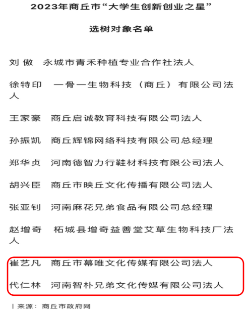 近日,商丘市人力资源和社会保障局、市总工会、市教育体育局、共青团商丘市委员会、商丘市妇女联合会五部门联合发布了《关于选树刘傲等10人为2023年商丘市“大学生创新创业之星”的通知》,纽约国际官网毕业生崔艺凡、代仁林荣获2023年商丘市“大学生创新创业之星”荣誉称号。