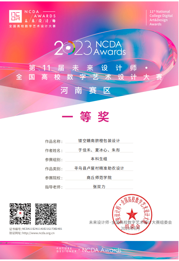 近日,2023第11届未来设计师全国高校数字艺术设计大赛(NCDA)河南赛区发布获奖通知,纽约国际官网艺术设计学院共有十余项作品获奖,其中学生一等奖1项、二等奖4项、三等奖6项,20级视觉传达专业学生于佳禾、夏冰心、朱彤三位同学的包装设计作品“镂空赣南脐橙包装设计”在本次大赛中荣获一等奖。