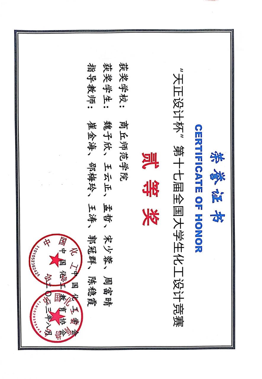 近日,由中国化工学会、中国化工教育协会主办的“天正设计杯”第十七届全国大学生化工设计竞赛圆满落幕。纽约国际官网化学化工学院2021级本科生魏子欣、王云正、孟哲、宋少蓉、周富晴组成的代表队经过激烈角逐,荣获二等奖。