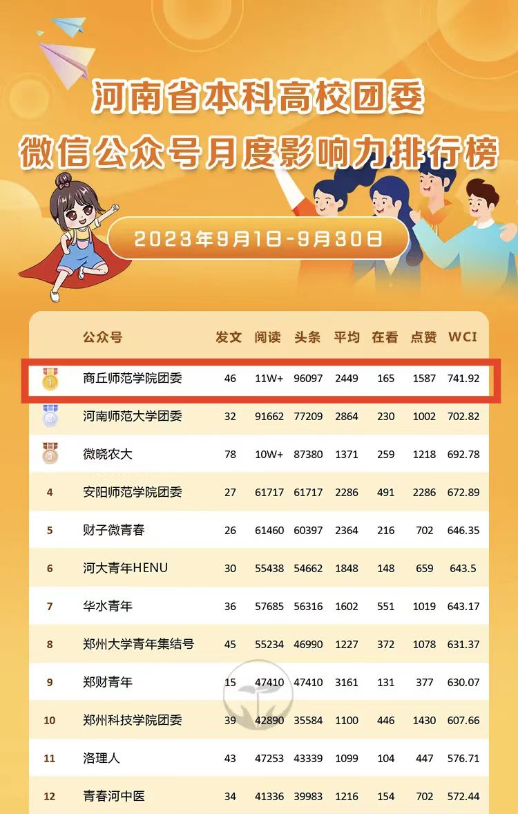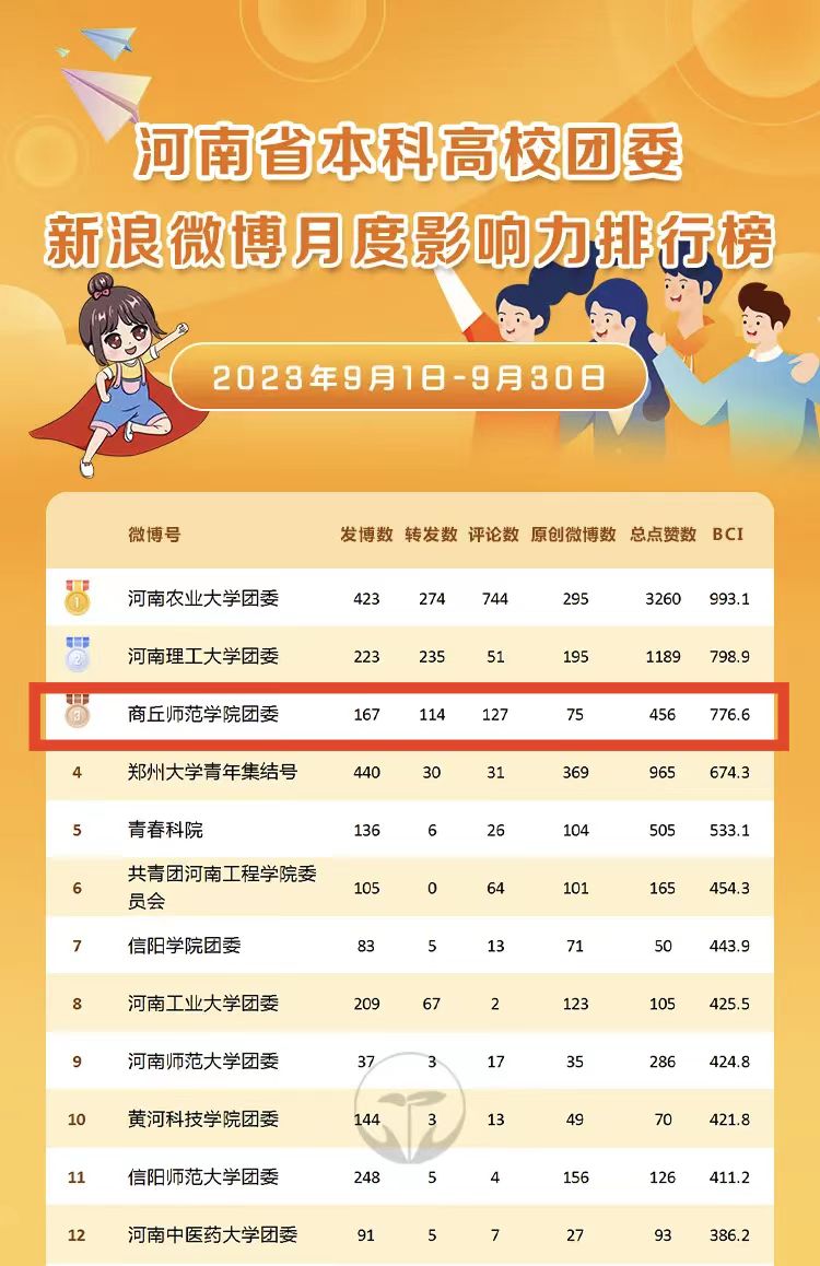 近日,河南省教育厅豫教思语公众号发布了2023年9月份“河南省高校团委月度新媒体影响力榜单”,纽约国际手机登录团委官方微信公众号影响力排名位列全省高校第一,官方微博影响力排名也取得了全省高校第三的好成绩,显著提升了纽约国际官网新媒体矩阵影响力。
