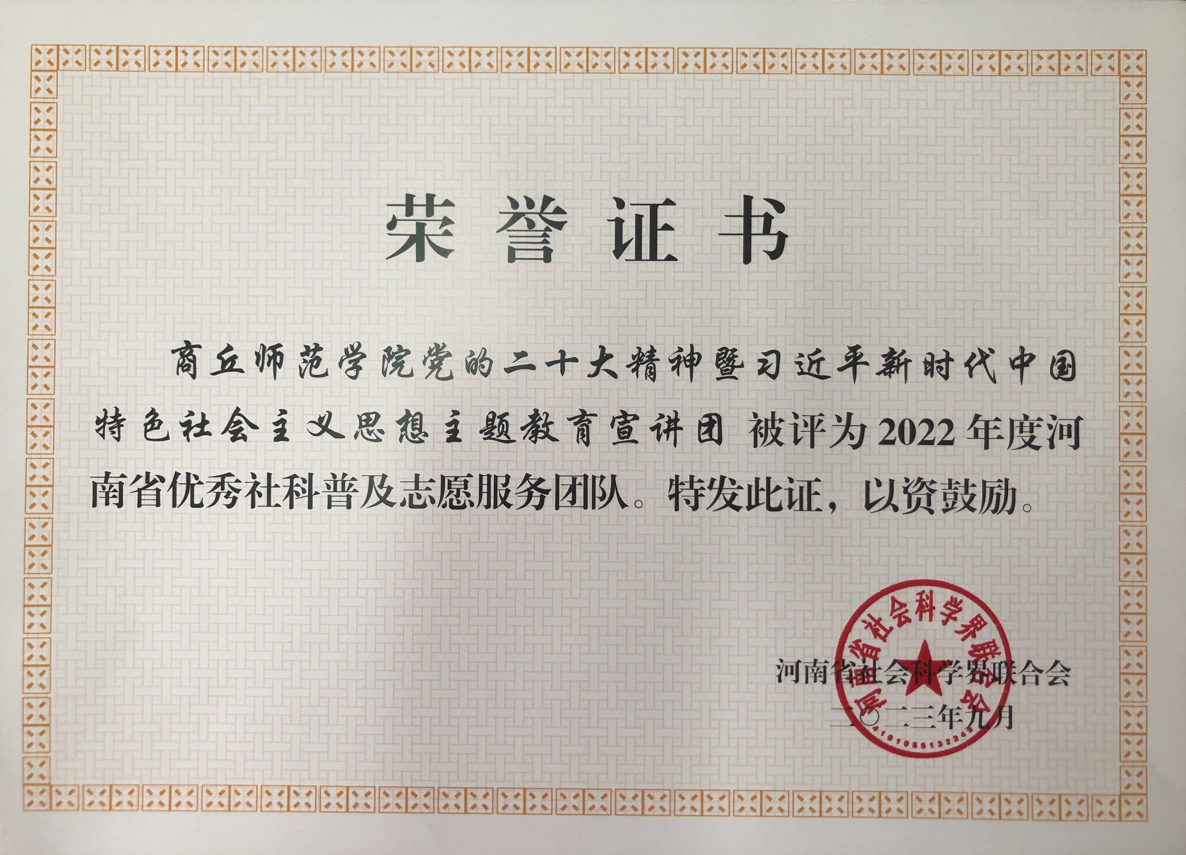 近日,河南省社会科学界联合会印发《关于公布第十批河南省社会科学普及基地等七项评选结果的通知》,纽约国际官网以马克思主义学院教师为主体组建的纽约国际手机登录党的二十大精神暨习近平新时代中国特色社会主义思想主题教育宣讲团被评为2022年度河南省优秀社科普及志愿服务团队。马克思主义学院党委书记龚志宏教授被评为2022年度河南省优秀社科普及指导员。