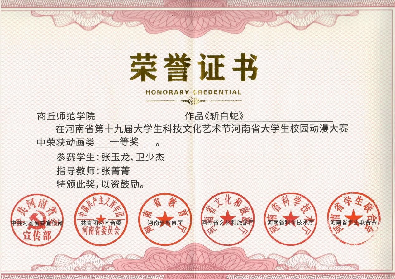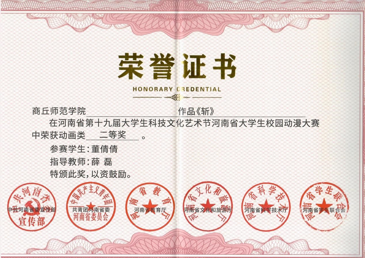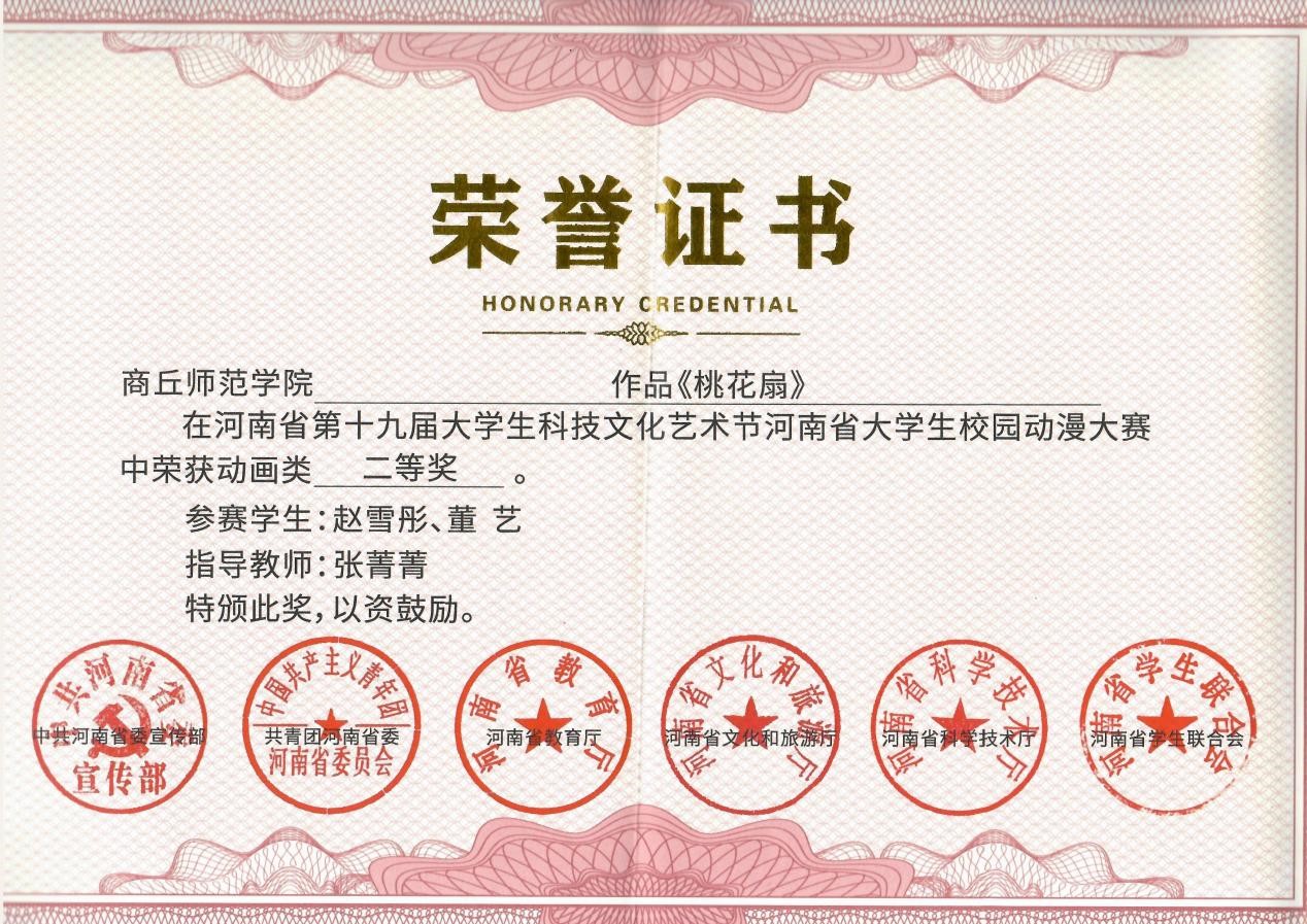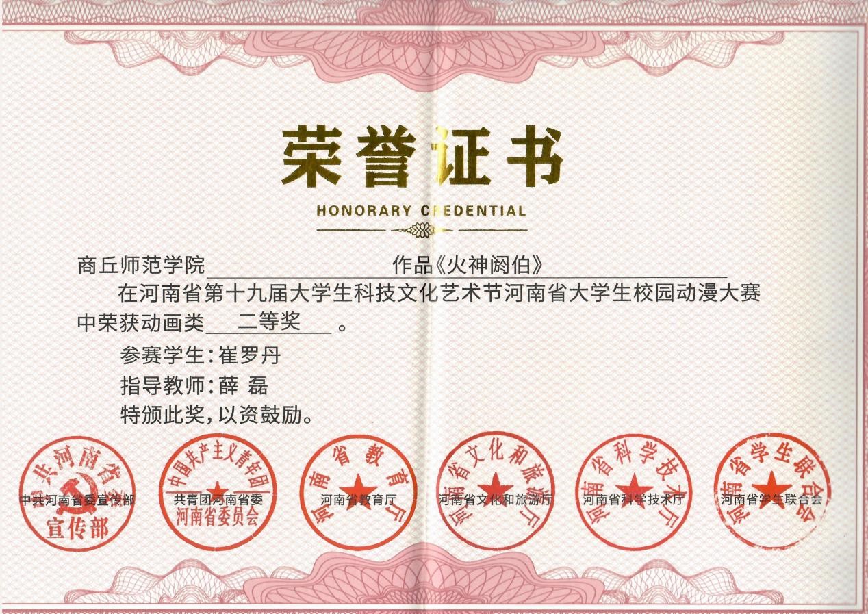 近日,由河南省委宣传部、团省委、省教育厅、省文化和旅游厅、省科技厅、省学联联合主办的第十九届大学生科技文化艺术节河南省大学生校园动漫大赛获奖证书已下发。其中纽约国际官网艺术设计学院学子荣获一等奖1项、二等奖3项,动画专业张菁菁老师被评为“优秀指导教师”称号。