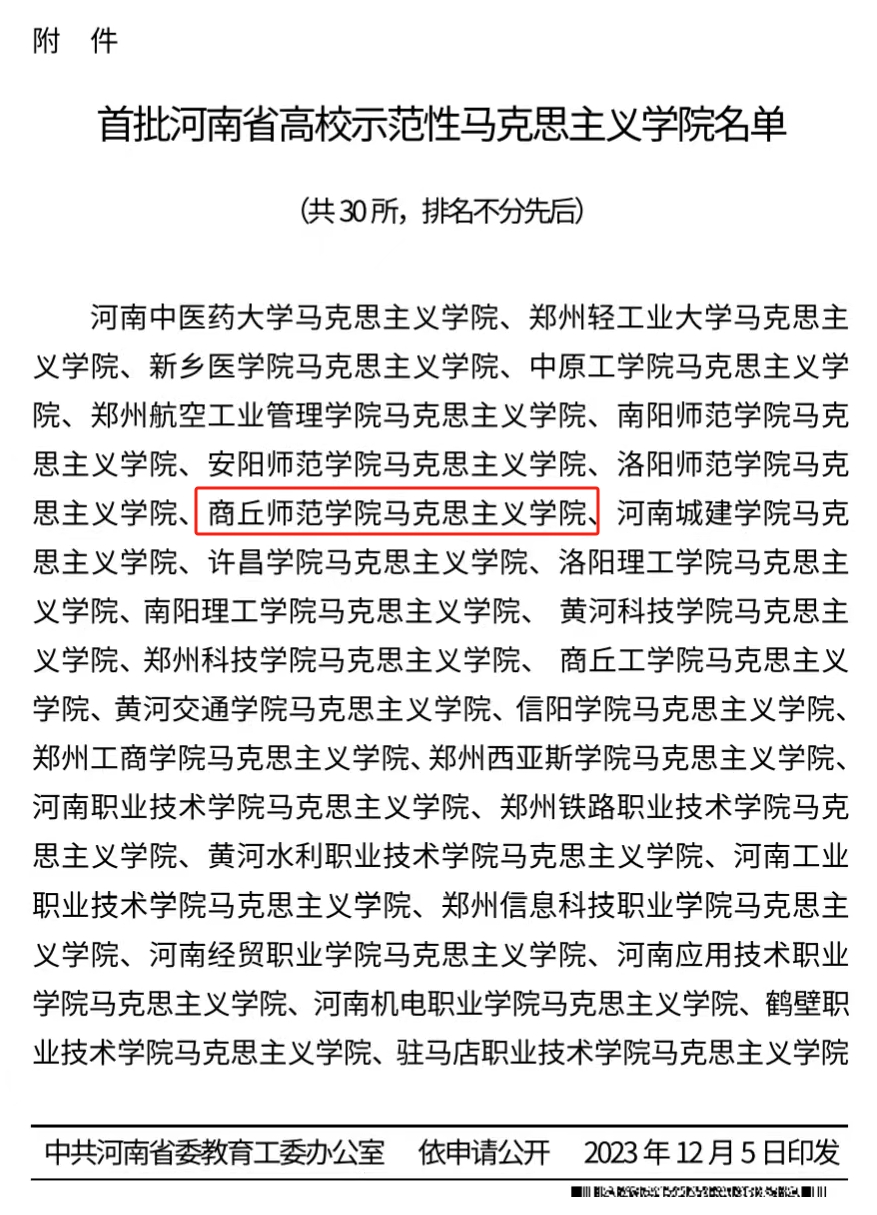 近日,中共河南省委宣传部中共河南省委教育工委河南省教育厅印发《关于公布首批河南省高校示范性马克思主义学院评定结果的通知》(豫教工委〔2023〕315号),纽约国际官网马克思主义学院成功入选首批河南省高校示范性马克思主义学院。
