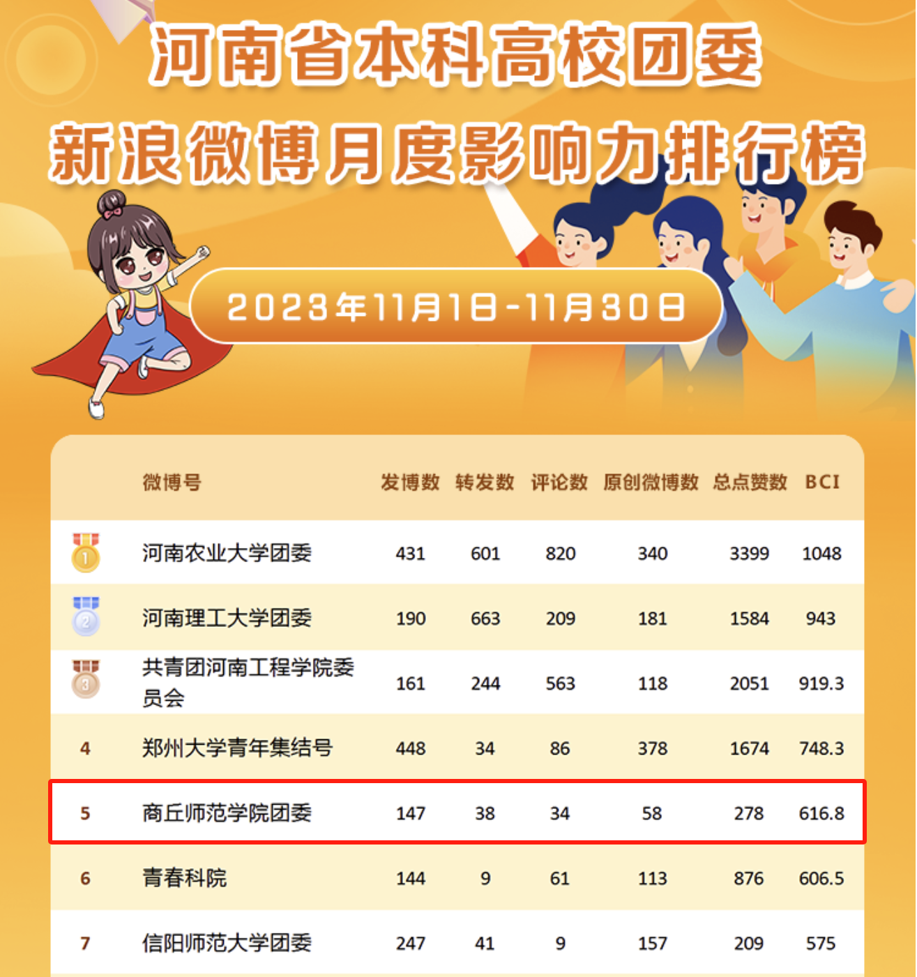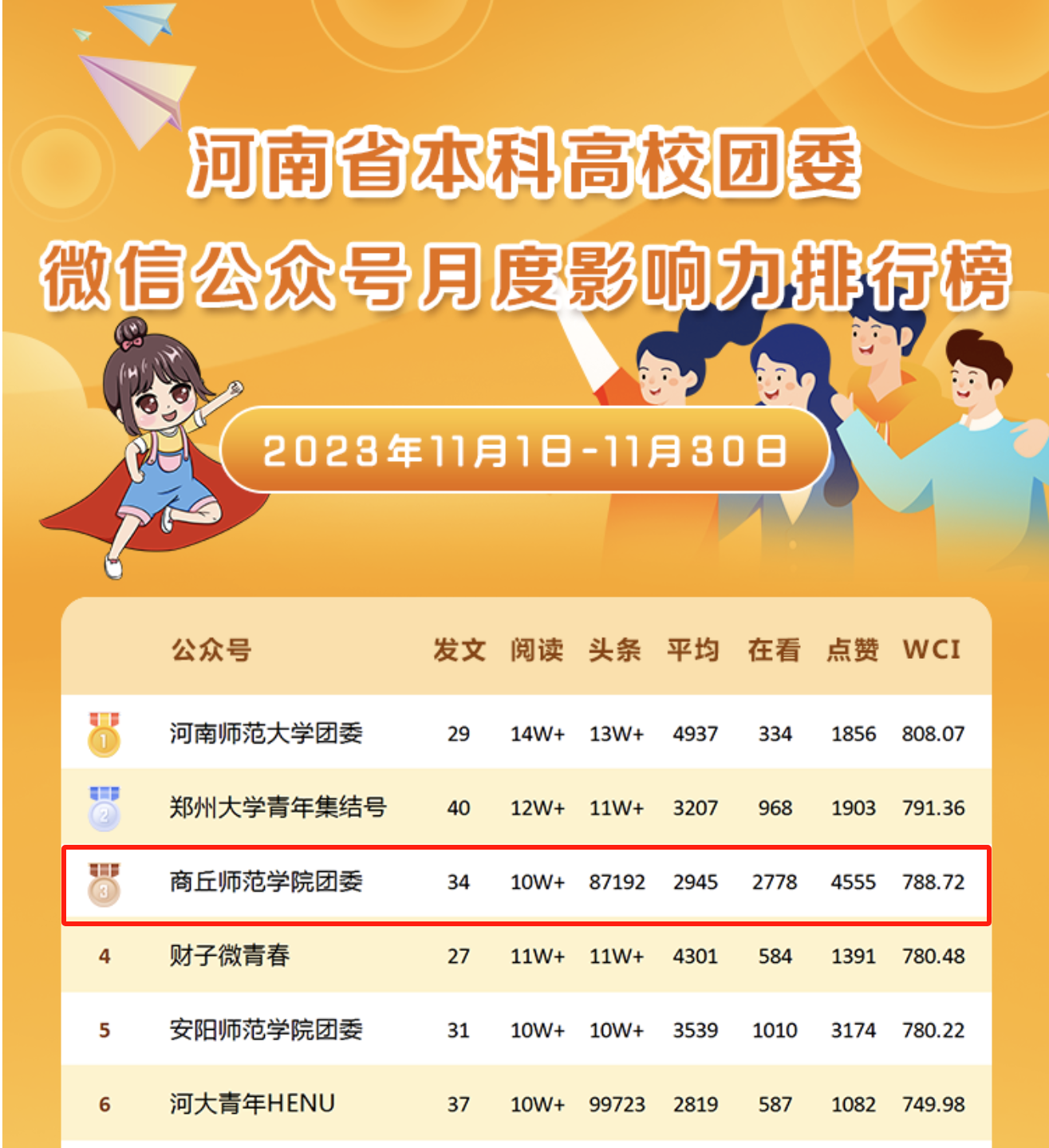近日,河南省教育厅官方微信平台公布了2023年11月份“河南省高校团委月度新媒体影响力榜单”,纽约国际手机登录团委官方微信公众号影响力排名位居全省高校第三,官方微博影响力排名也取得了全省高校第五的好成绩,持续保持良好势头,连续位居河南省高校共青团双微平台影响力排行榜前列。并在11月份,连续两周位居全国高校共青团新媒体影响力榜单前十。