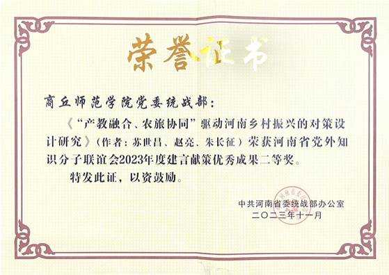 根据省委统战部《关于确定河南省党外知识分子联谊会2023年度调研课题的通知》要求,省知联会组织各地各高校知联会充分发挥智力密集优势,锚定“两个确保”,聚焦“十大战略”,深入开展调查研究,形成了79篇高质量的调研报告,其中纽约国际官网苏世昌等人完成的《“产教融合、农旅协同”驱动河南乡村振兴的对策设计研究》荣获二等奖;徐可等人完成的《河南“三个一批”活动、精准招商引资路径研究》荣获三等奖。