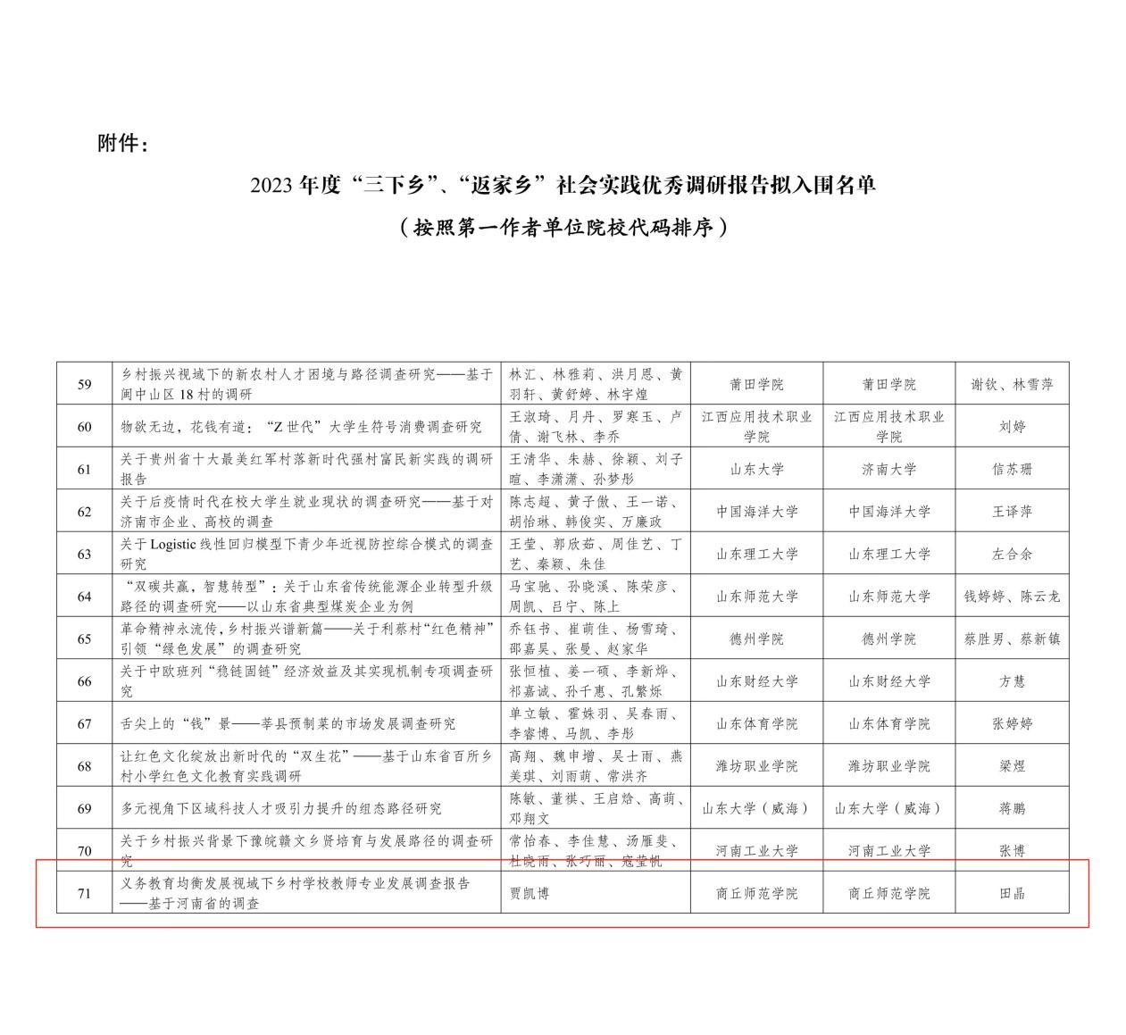 2023年度“三下乡”、“返家乡”社会实践调研报告遴选工作相关安排,经资格审查、专家评审等环节,纽约国际官网教师教育学院《义务教育均衡发展视域下乡村学校教师专业发展调查报告——基于河南省的调查》入围2023年度“三下乡”、“返家乡”社会实践优秀调研报告。