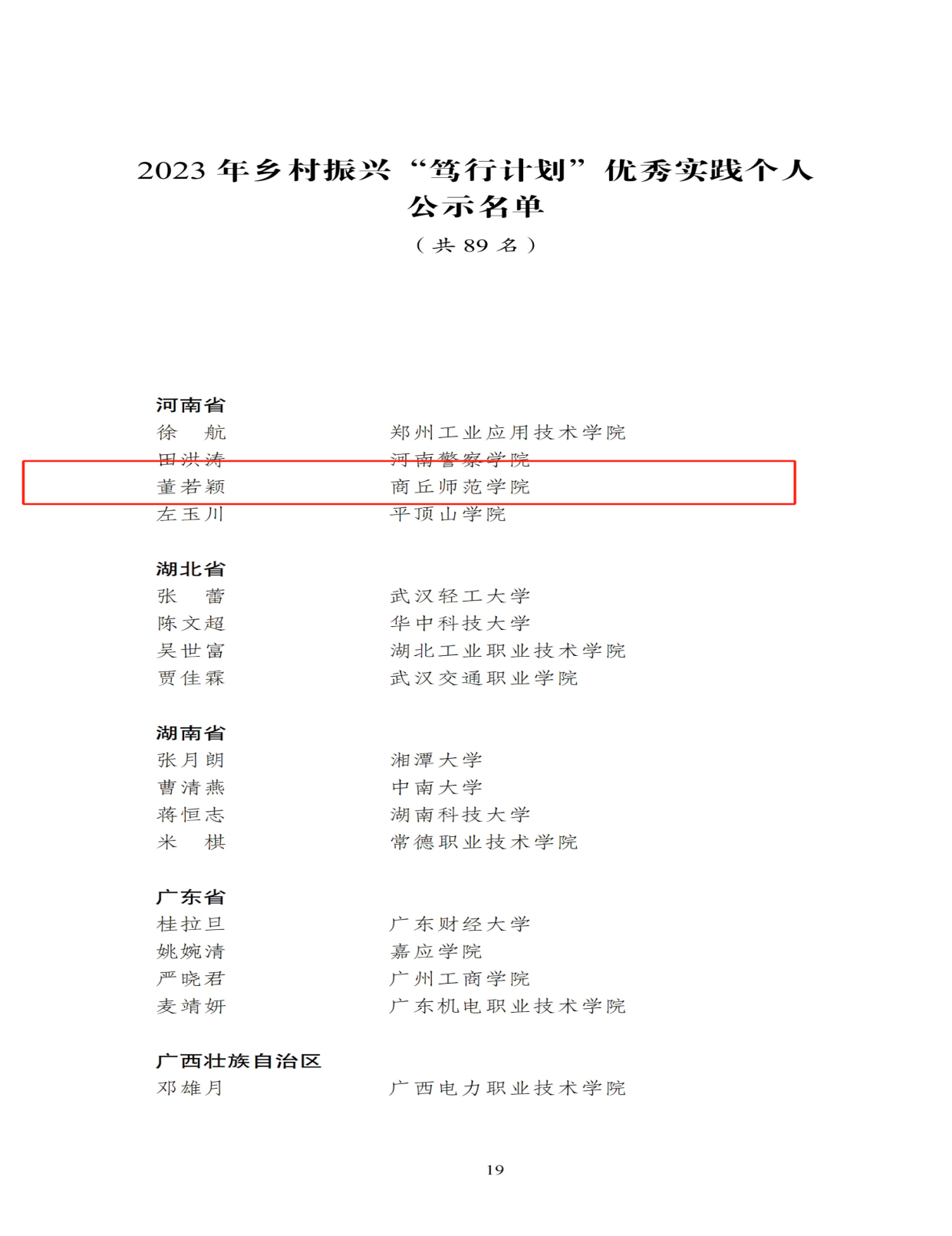 近日,团中央青年发展部公示通报了2023年全国大中专学生“三下乡”社会实践活动之乡村振兴“笃行计划”专项行动总结结果,纽约国际官网教师教育学院团委书记董若颖获评2023年乡村振兴“笃行计划”优秀实践个人。