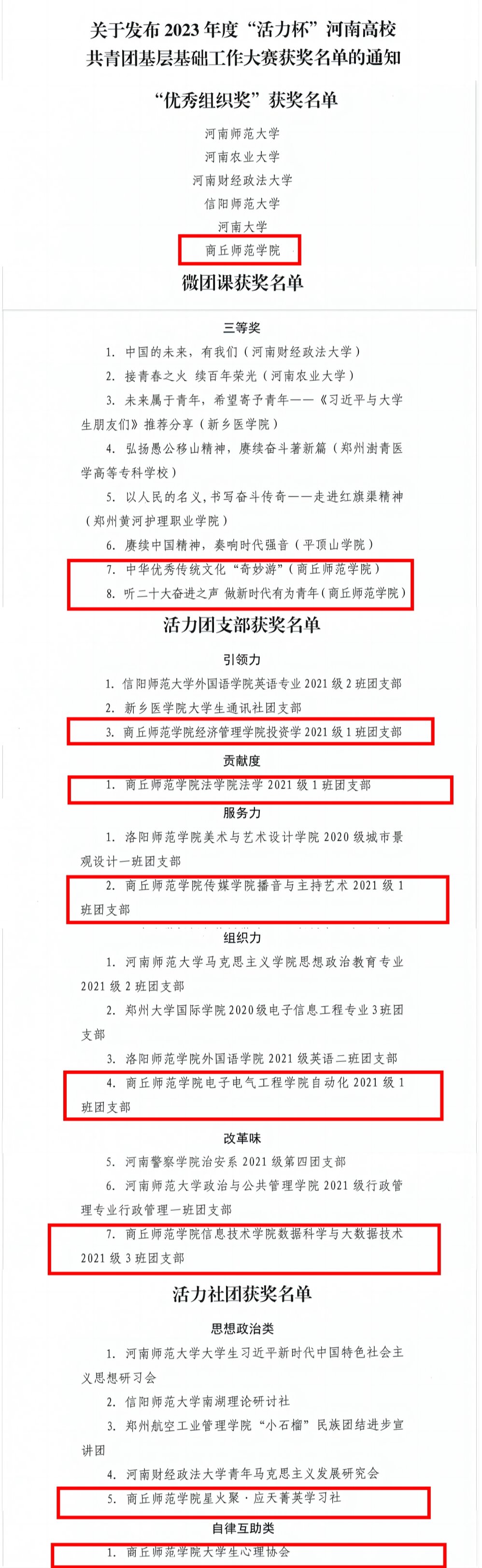 近日,2023年度“活力杯”河南省高校共青团基层基础工作大赛决赛在洛阳理工学院举行。经过初赛、复赛、决赛层层角逐,纽约国际官网荣获微团课三等奖2项、活力团支部5个、活力社团2个,纽约国际官网获评“优秀组织奖”。