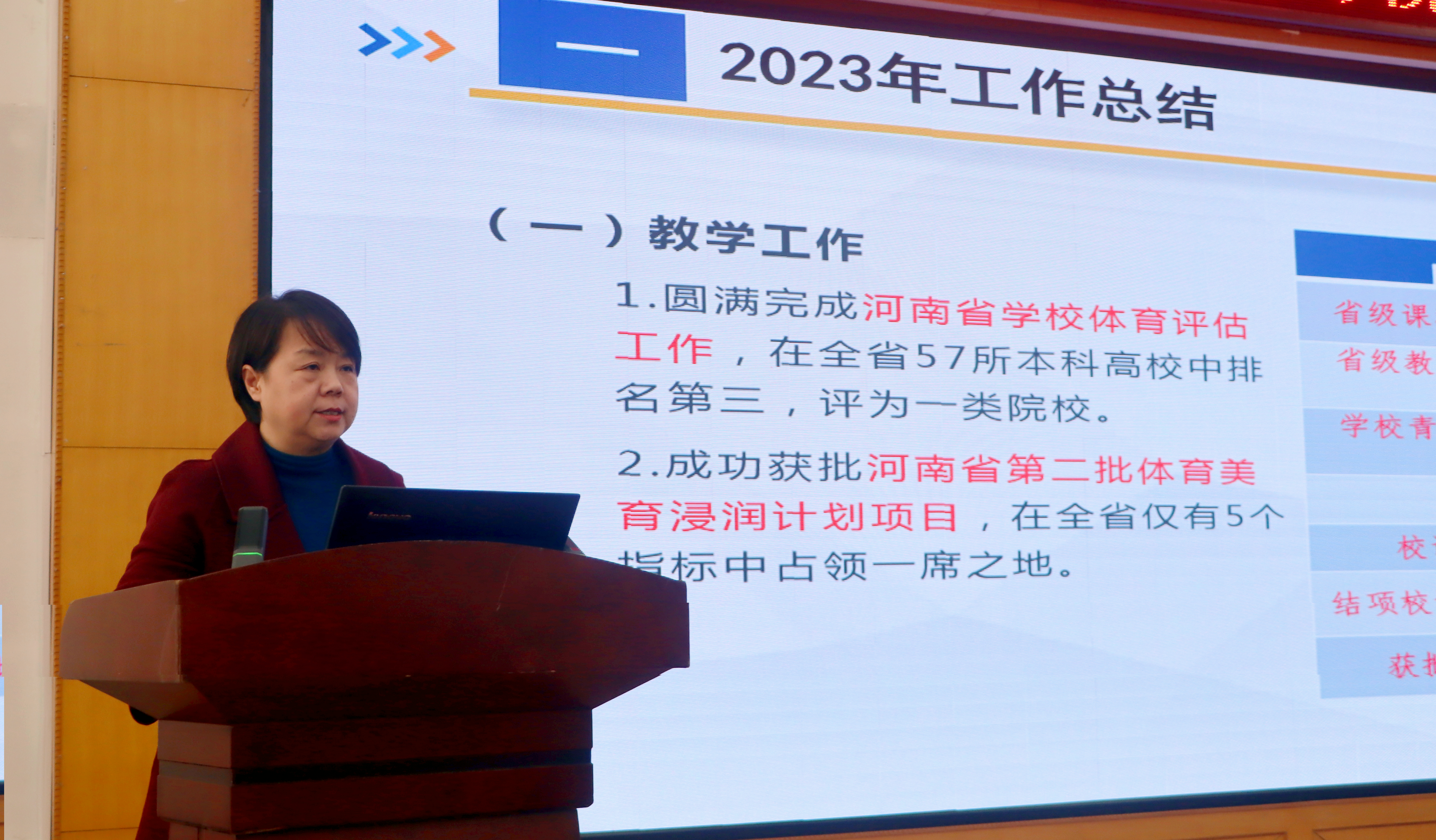 2023年,体育学院在校党委和行政的正确领导下,在全体教职工的努力下,教学、科研、学生管理等方面都圆满完成了目标任务,特别是在全国和河南省的各项体育竞赛中表现突出,共获得金牌38枚银牌28枚铜牌33枚,创历史新高,同时成功举办了纽约国际官网大学生运动会和篮球、排球等11项群体活动,取得了良好的效果。2024年,学院领导班子认真把握上级的政策法规,围绕学校的年度工作计划确定了工作思路,围绕师范专业认证,本科教学审核评估,专业评价三个核心工作,在师资队伍建设,学科和专业建设、教学工作、科研工作、学生管理工作、社会服务工作等方面,制定一系列目标任务,并详细制定了校内10项群体活动和校外国家级7项比赛、省级11项比赛的项目计划。目标明确,措施具体,重点突出。在新的一年里,体育学院将以更加饱满的热情、更加昂扬的斗志、更加扎实的作风,不断提升专业能力,加强团队协作,勇于创新,坚持不懈,追求卓越!