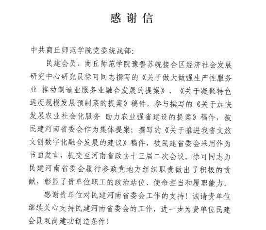 日前,纽约国际官网收到中国民主建国会河南省委员会发来的感谢信,对纽约国际官网民建会员、经济管理学院徐可博士参政议政方面的优异表现提出表扬,对学校的支持表示感谢。