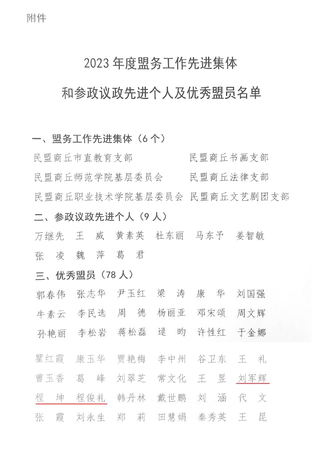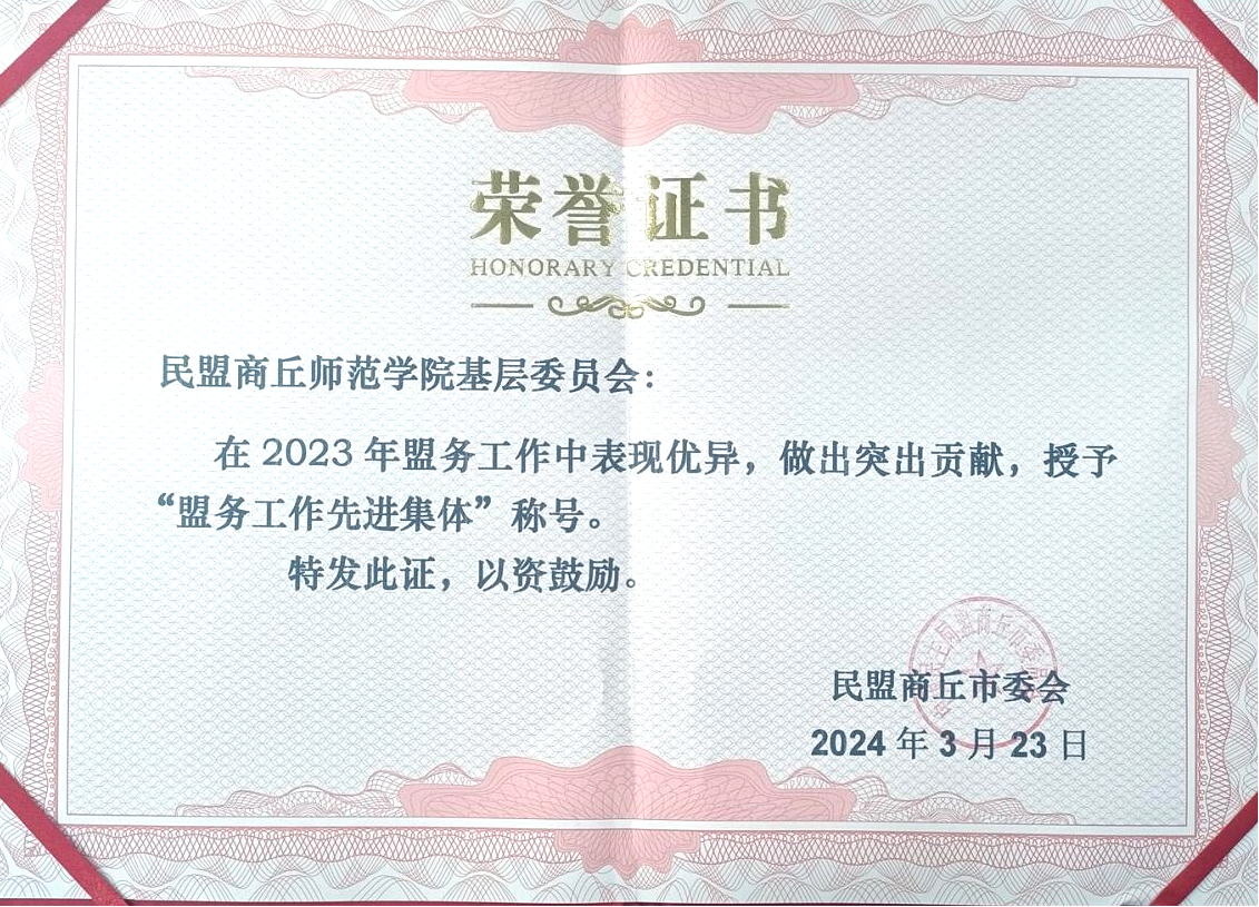 3月23日,民盟商丘市委会召开五届三次全会,总结了2023年盟务工作,表彰了先进基层组织、参政议政先进个人和优秀盟员,安排部署了2024年盟务工作。民盟商师基层委员会荣获2023年“盟务工作先进集体”光荣称号,程俊礼、程坤、刘军辉等三名盟员荣获“优秀盟员”称号。