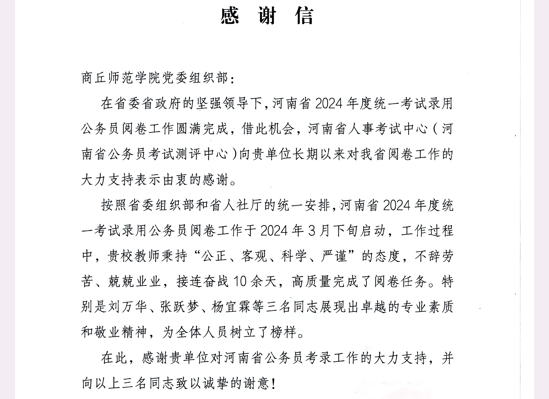 日前,纽约国际官网收到河南省人事考试中心发来的感谢信,对纽约国际官网20名教师在河南省2024年度统一考试录用公务员阅卷工作中的优异表现提出表扬,对学校的支持表示感谢,特别对刘万华、张跃梦、杨宜霖3名教师点名提出表扬。