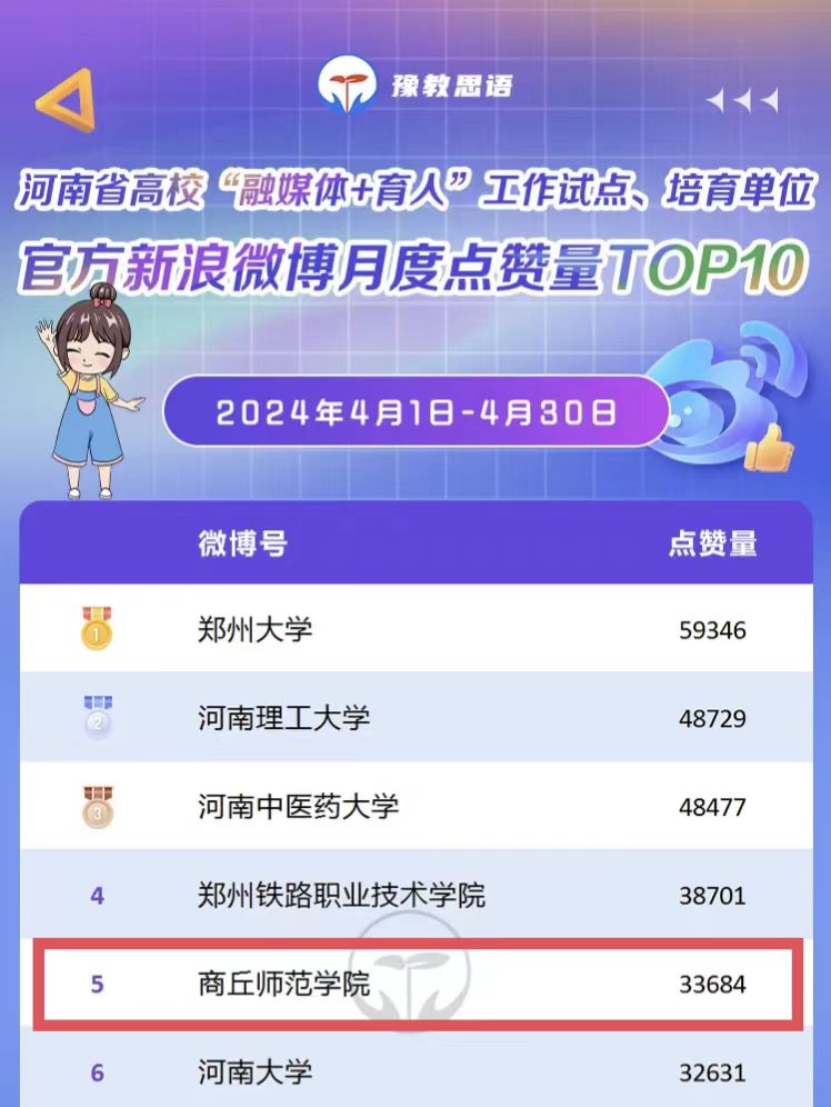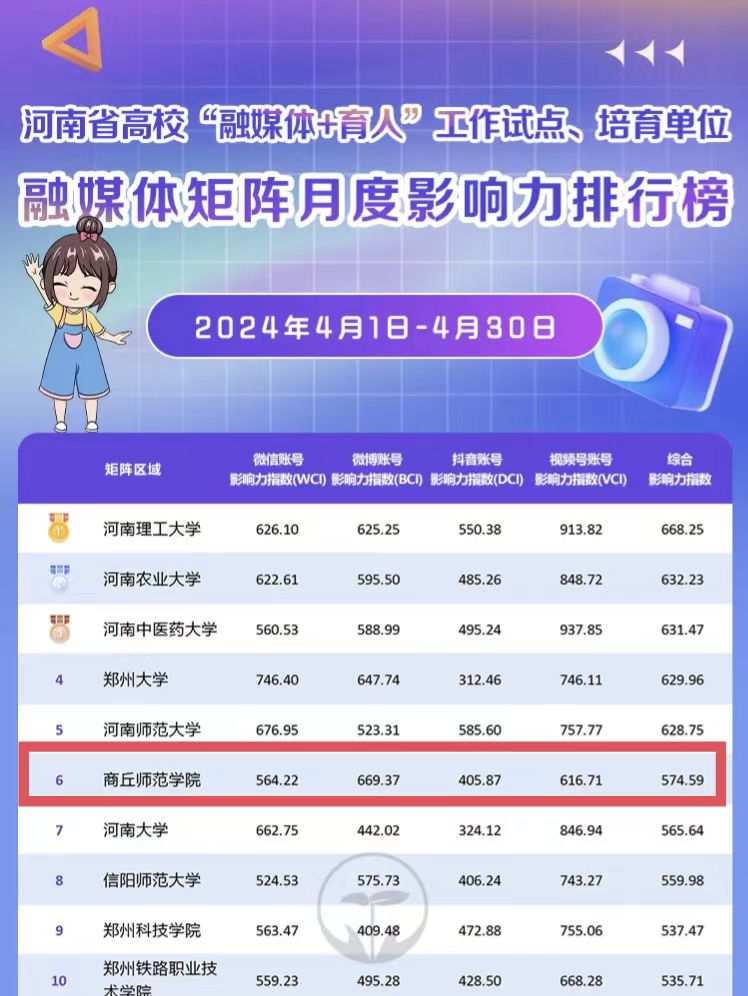 近日,在河南省教育厅“豫教思语”微信公众号发布的河南省高校“融媒体+育人”工作试点单位、培育单位融媒体矩阵4月份影响力(WCI、BCI、DCI、VCI)排行榜中,对融媒体矩阵区域包含的微信、微博、抖音、视频号进行综合考量和评价。数据显示,纽约国际官网4月份融媒体矩阵影响力指数574.59,位居河南省高校榜单第6名。其中,官方微博月度排行榜,位居河南省高校第3名。